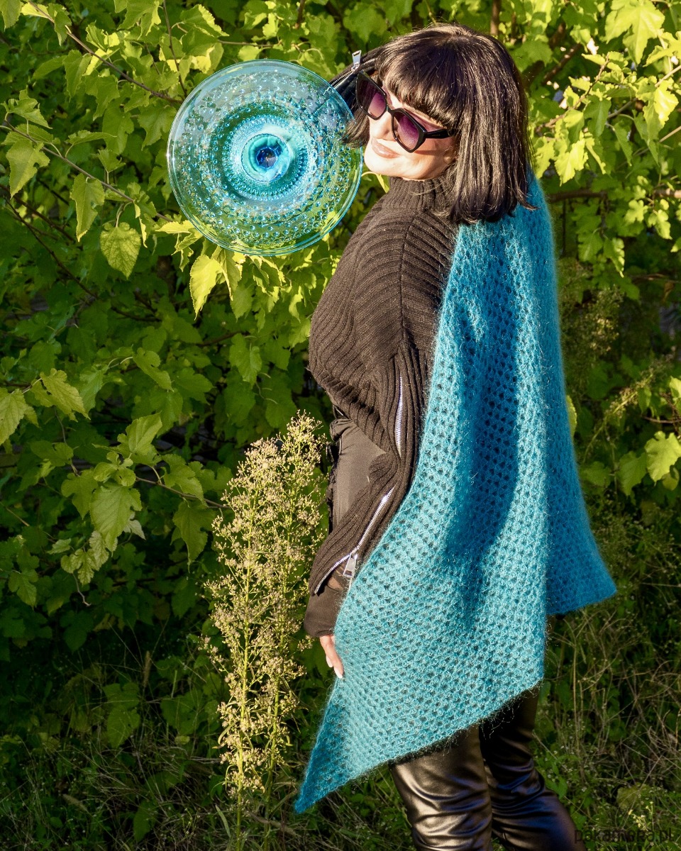 Chusta trójkątna wykonana z moheru 70 % i jedwab 30 % w kolorze turkusowym.