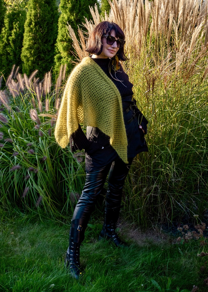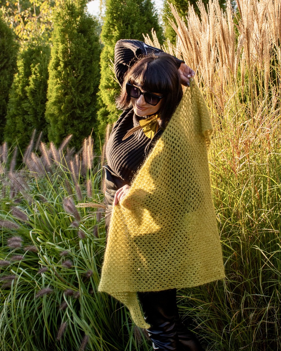 Wykonana z luksusowej przędzy o wyjątkowo cienkiej strukturze, moher z jedwabiem, w ażurowy wzór, który przypomina delikatny splot pajęczej nici. Każdy rząd to harmonijna gra oczek i przestrzeni, tworząca niepowtarzalny, lekki ażur.
