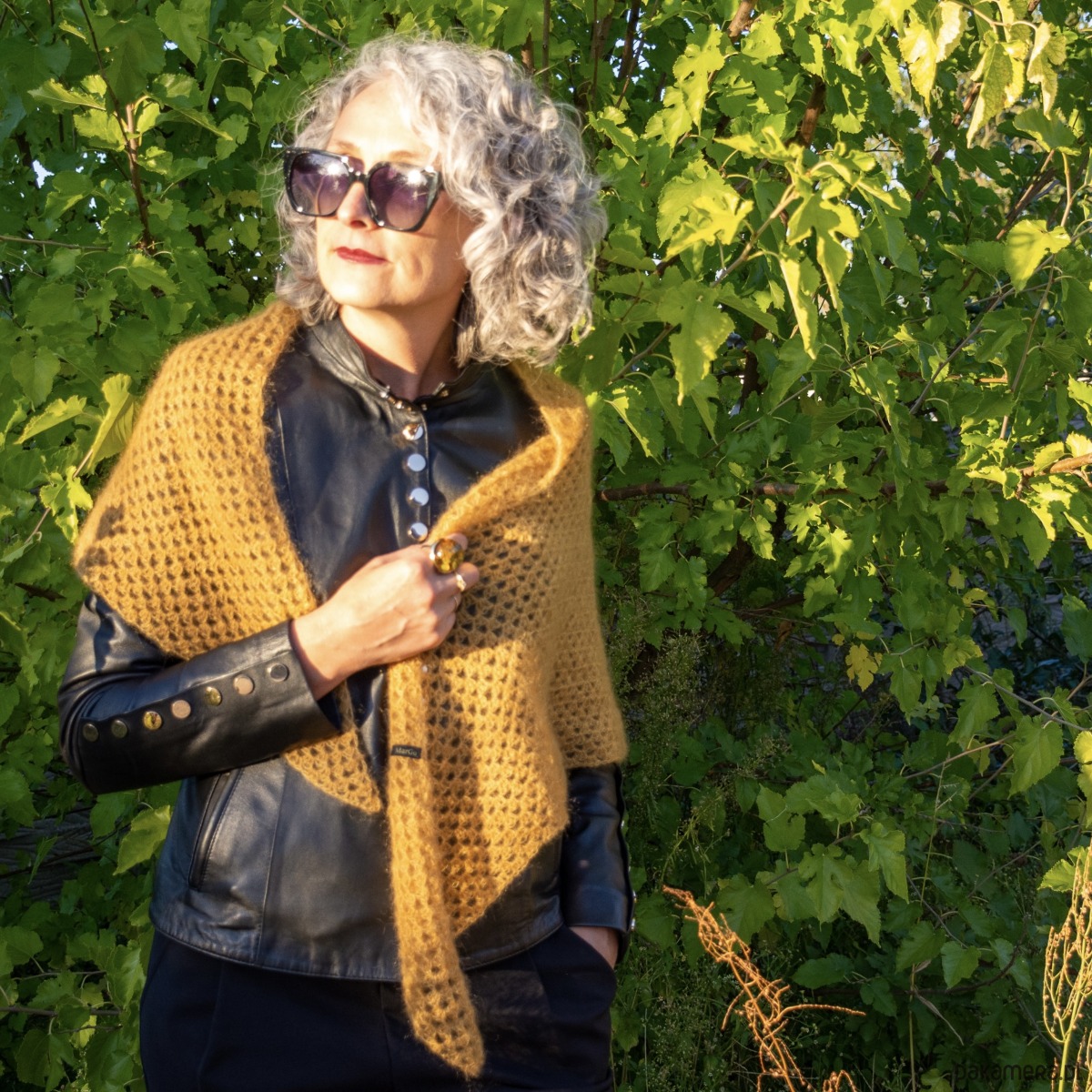 Chusta trójkątna wykonana z moheru 70 % i jedwab 30 % w kolorze miodowym.