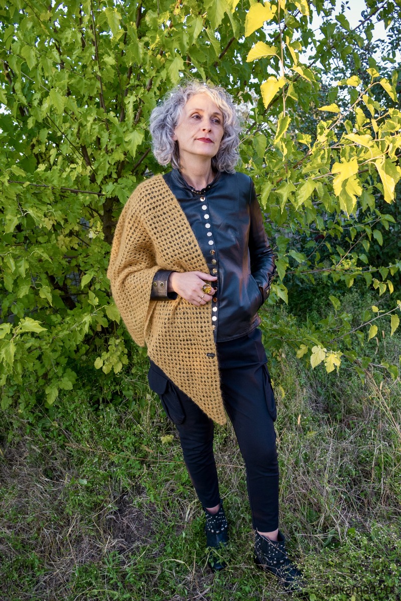 Wykonana z luksusowej przędzy o wyjątkowo cienkiej strukturze, moher z jedwabiem, w ażurowy wzór, który przypomina delikatny splot pajęczej nici. Każdy rząd to harmonijna gra oczek i przestrzeni, tworząca niepowtarzalny, lekki ażur.