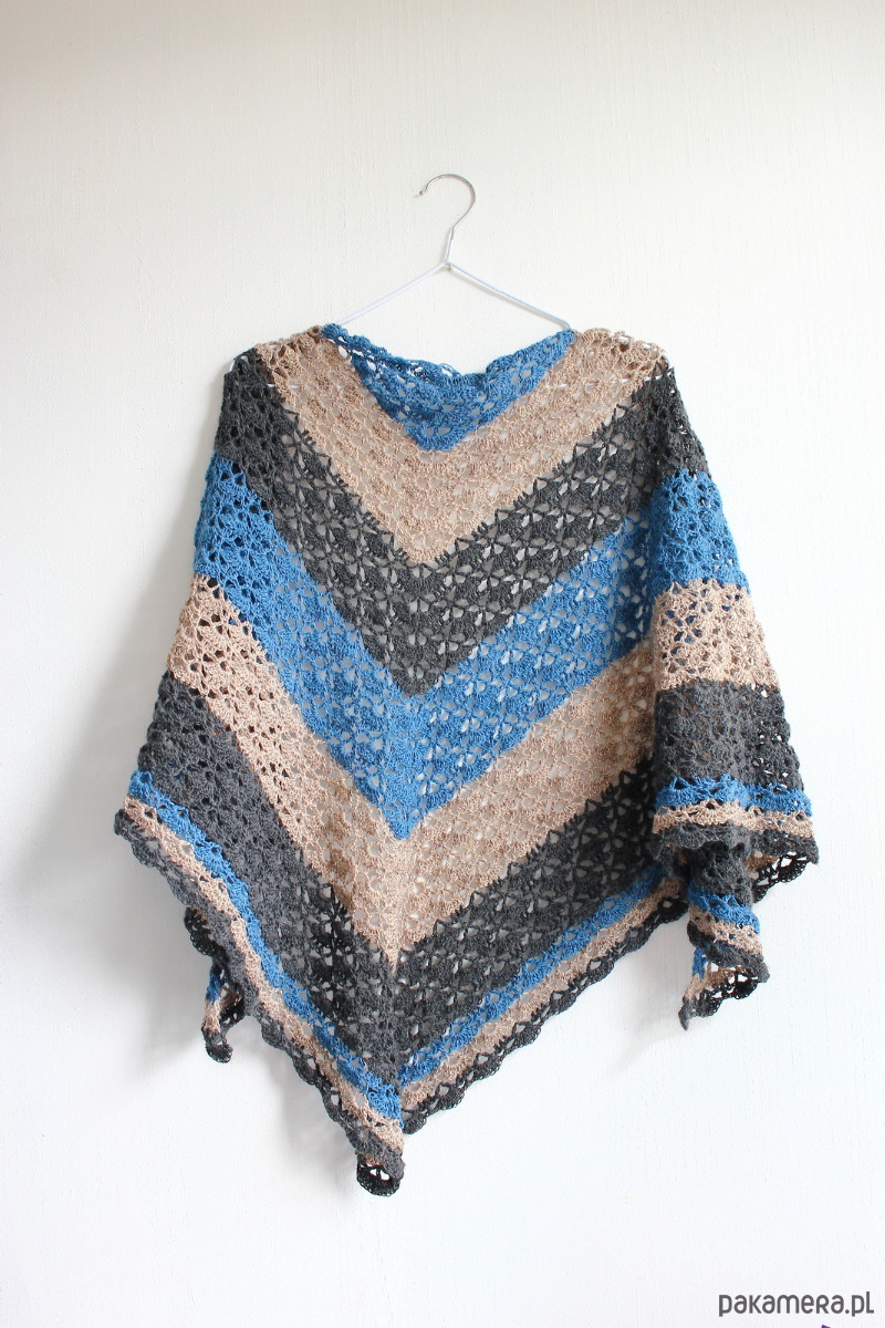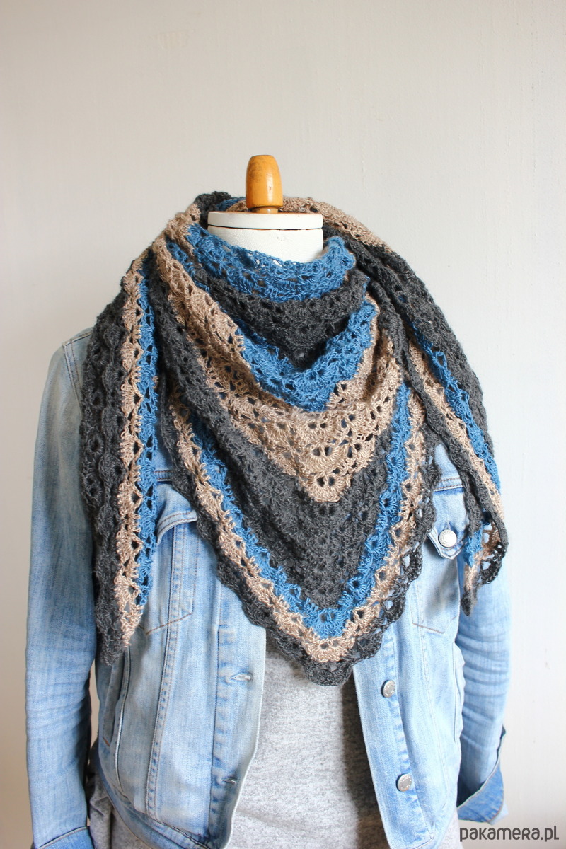 Niezwykle leciutka i delikatna chusta zrobiona na szydełku z milutkiej włóczki w trzech kolorach: jeans, beż i ciemny grafit.