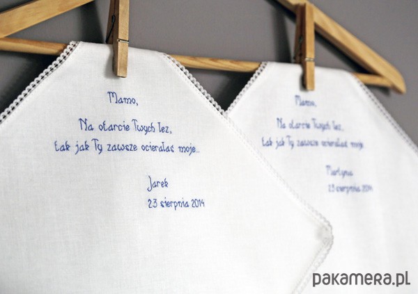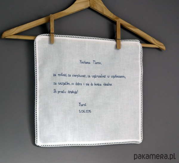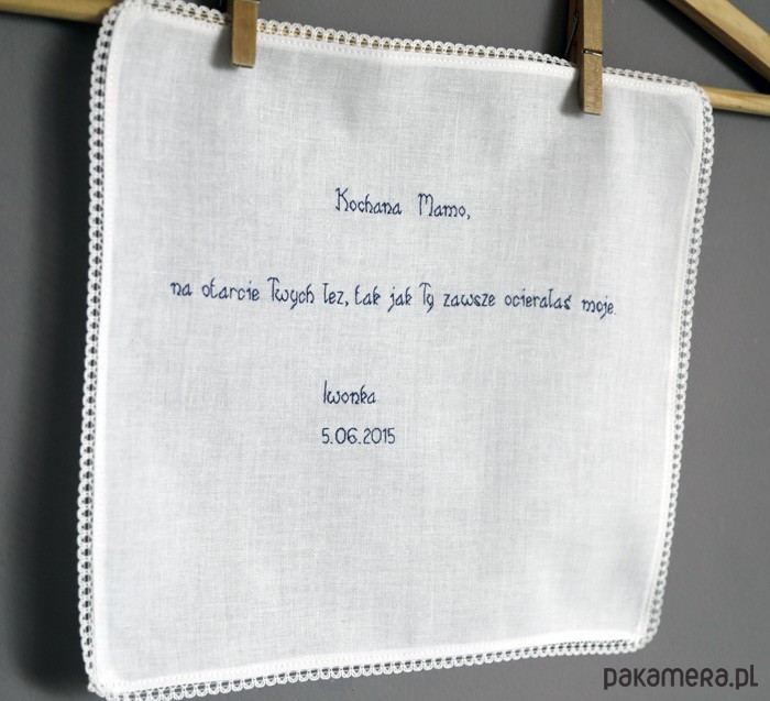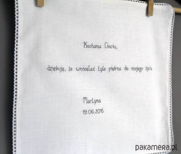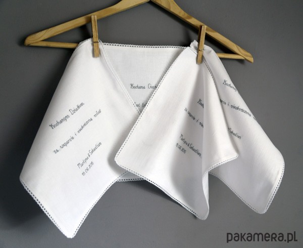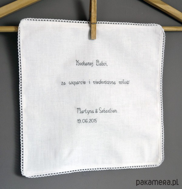 Ręcznie haftowana biała chustka z podziękowaniami dla rodziców, dziadków, gości ślubnych. Piękna, personalizowana pamiątka, jedyna w swoim rodzaju. Kolor haftu, jego treść i układ dowolne. Chustka ma około 25/25 cm. Wąska koronka. Koronka moze różnić się od tej ze zdjęć. Cena za 1 sztukę. Czas realizacji w zależności od ilości chustek oraz treści haftu wynosi 7-12 dni roboczych. Polecam!