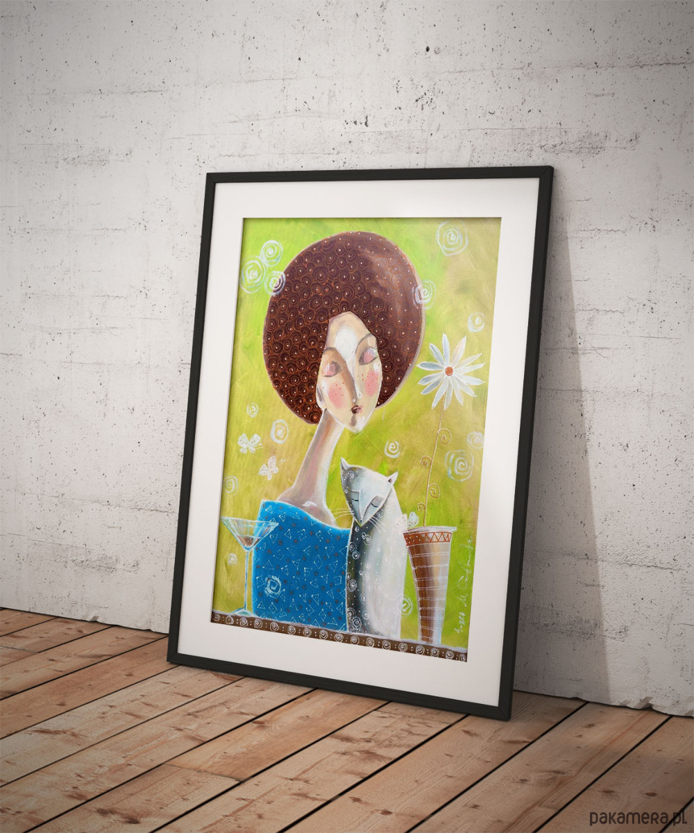 Reprodukcja obrazu własnego autorstwa zatytułowanego "Chwila spokojnej melancholii", wydrukowana na wysokiej jakości satynowanym papierze o gramaturze 200-220 g/m² w technologii druku pigmentowego, która to technologia zapewnia doskonałe odwzorowanie kolorów oraz trwałość i odporność na promieniowanie UV. Ostatnie zdjęcie przedstawia wydruk w formacie A4 oprawiony w drewnianą ramę z białym passe-partout. Wymiar zewnętrzny ramy: 30x40 cm.