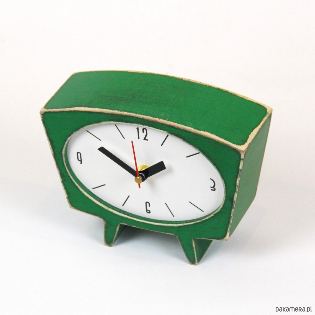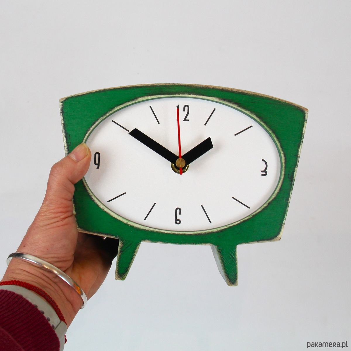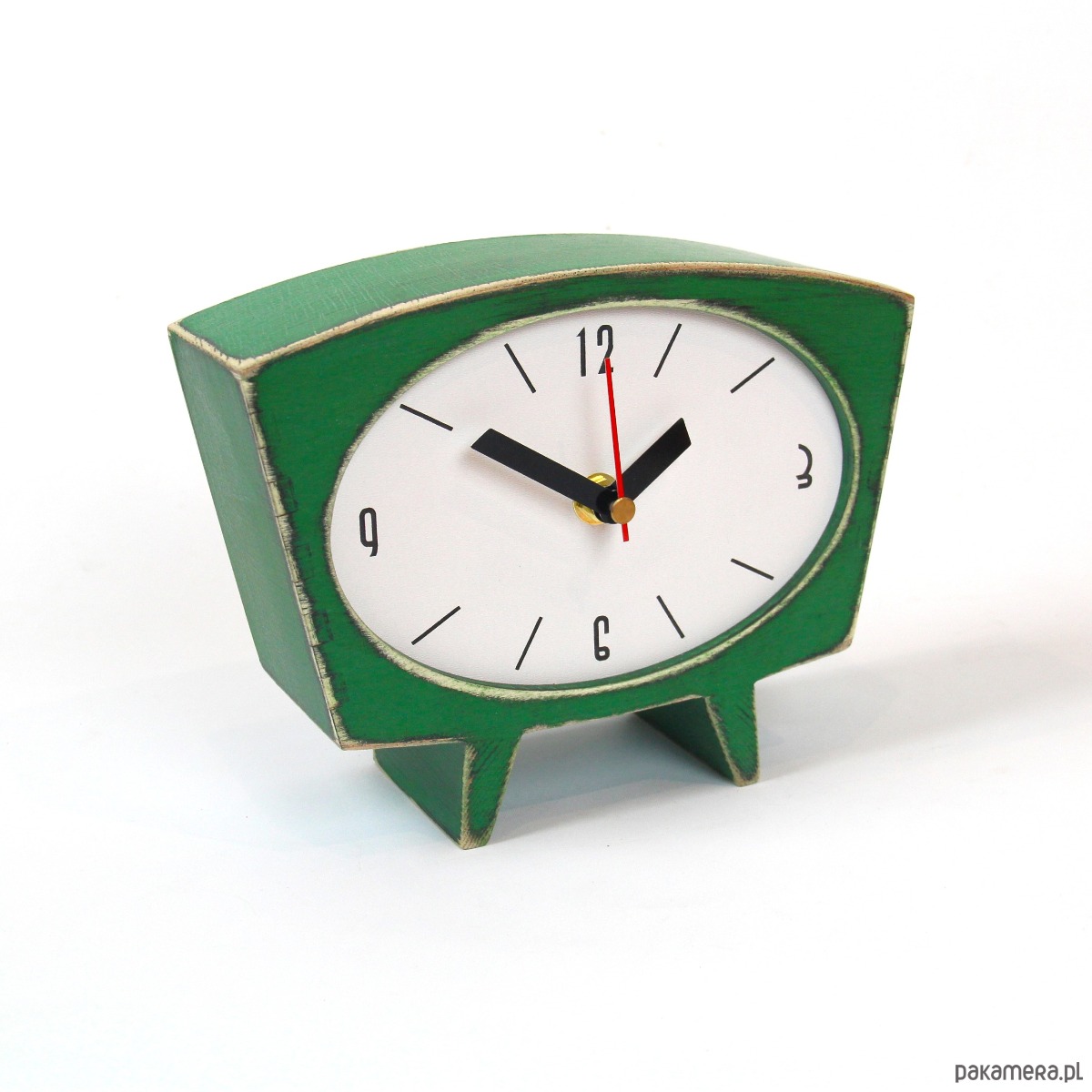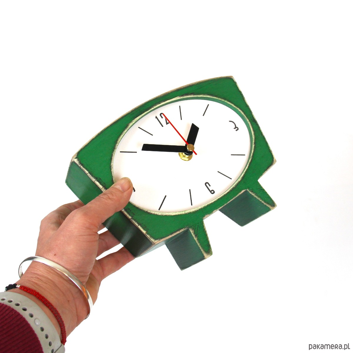 Nowa kolekcja inspirowana latami 60 i 70. Ten mały zgrabny zegarek jest idealny na prezent, dekoracyjny element każdego wnętrza, któremu doda charakteru minionych lat. wymiary 16 cm x 19 cm x 7,5 cm. Zegarek pomalowany został farbami akrylowymi i zabezpieczony ekologicznym lakierem. Wykonany ze sklejki drewnianej