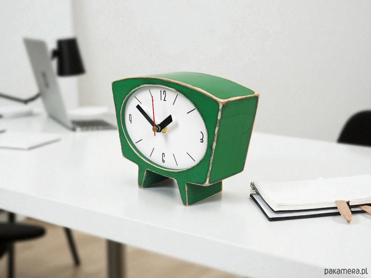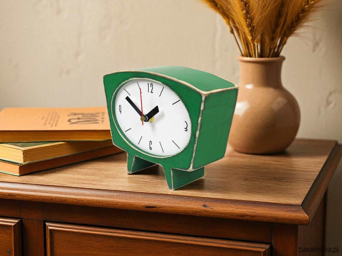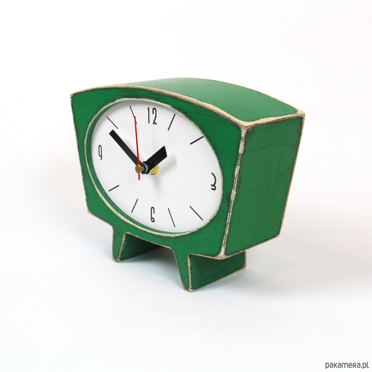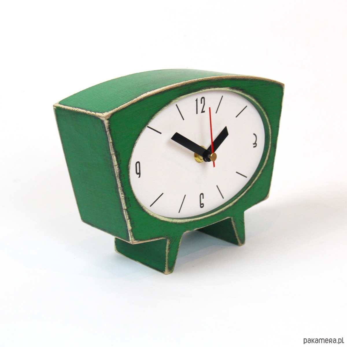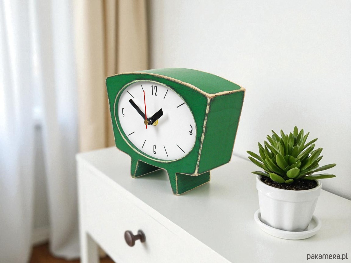 Nowa kolekcja inspirowana latami 60 i 70. Ten mały zgrabny zegarek jest idealny na prezent, dekoracyjny element każdego wnętrza, któremu doda charakteru minionych lat. wymiary 16 cm x 19 cm x 7,5 cm. Zegarek pomalowany został farbami akrylowymi i zabezpieczony ekologicznym lakierem. Wykonany ze sklejki drewnianej
