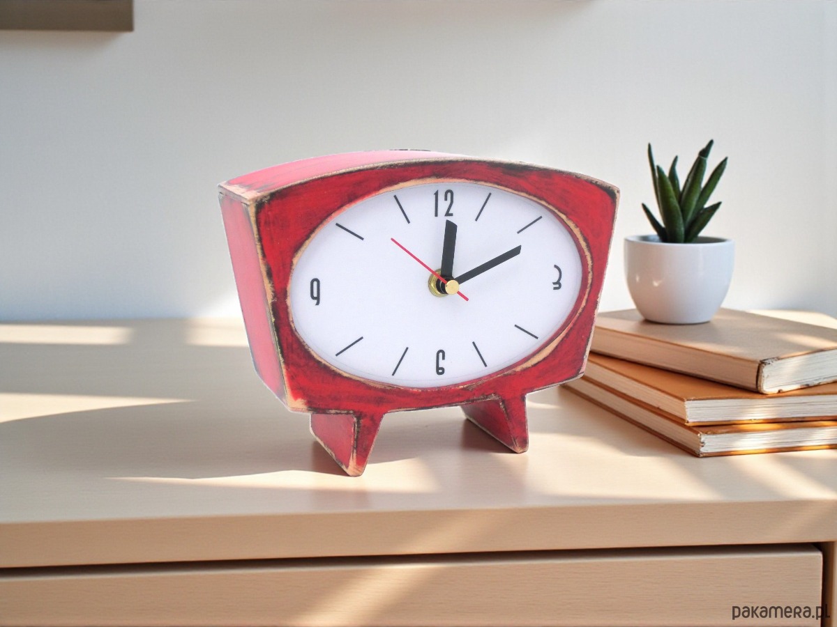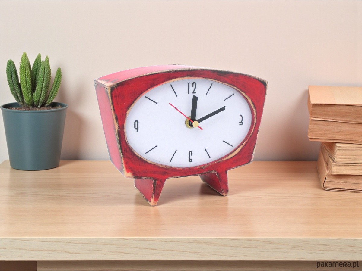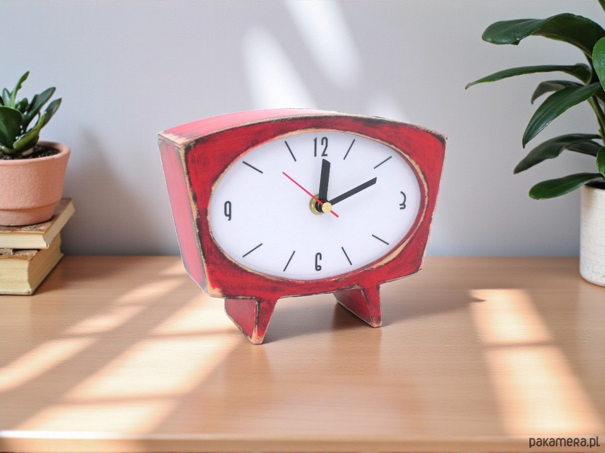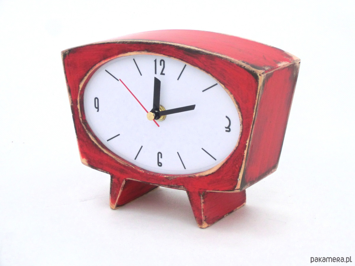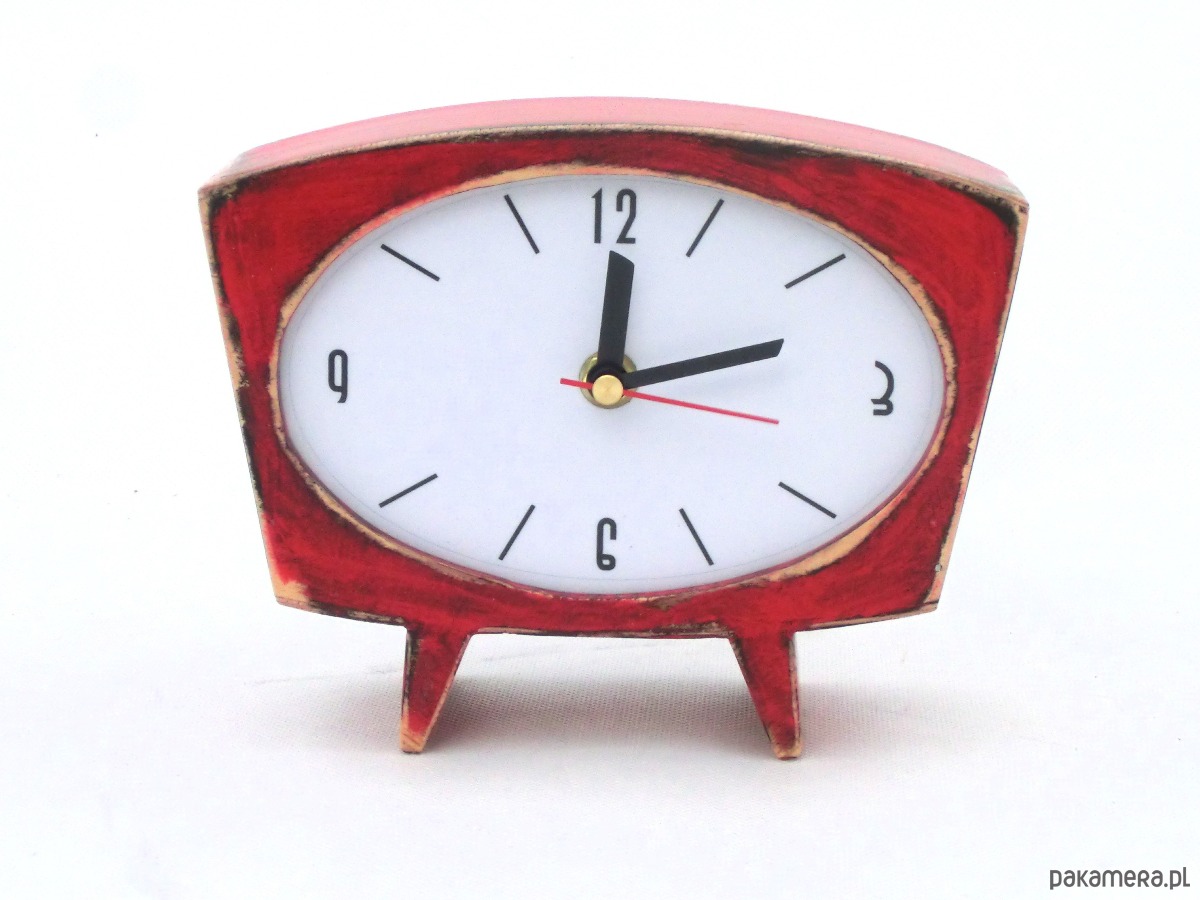 Nowa kolekcja inspirowana latami 60 i 70. Ten mały zgrabny zegarek jest idealny na prezent, dekoracyjny element każdego wnętrza, któremu doda charakteru minionych lat. wymiary 16 cm x 19 cm x 7,5 cm. Zegarek pomalowany został farbami akrylowymi i zabezpieczony ekologicznym lakierem. Wykonany ze sklejki drewnianej