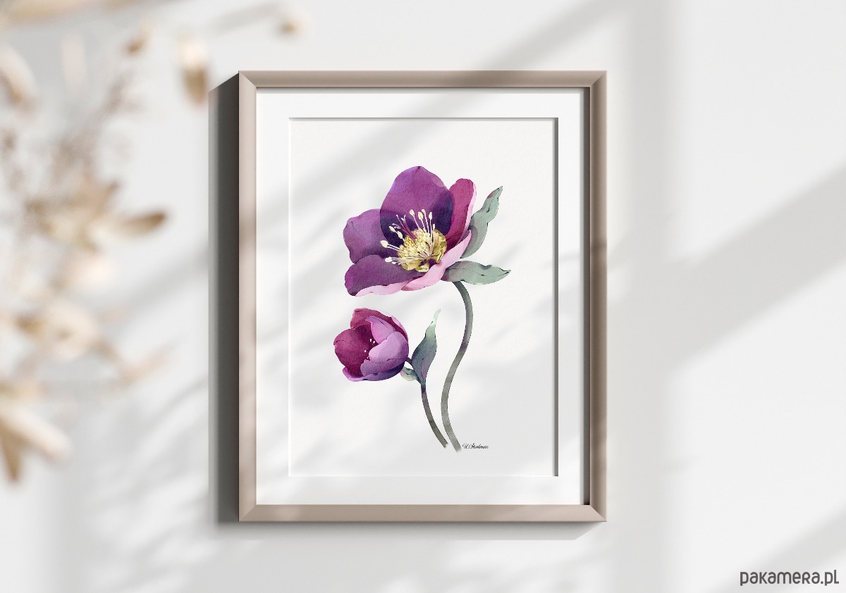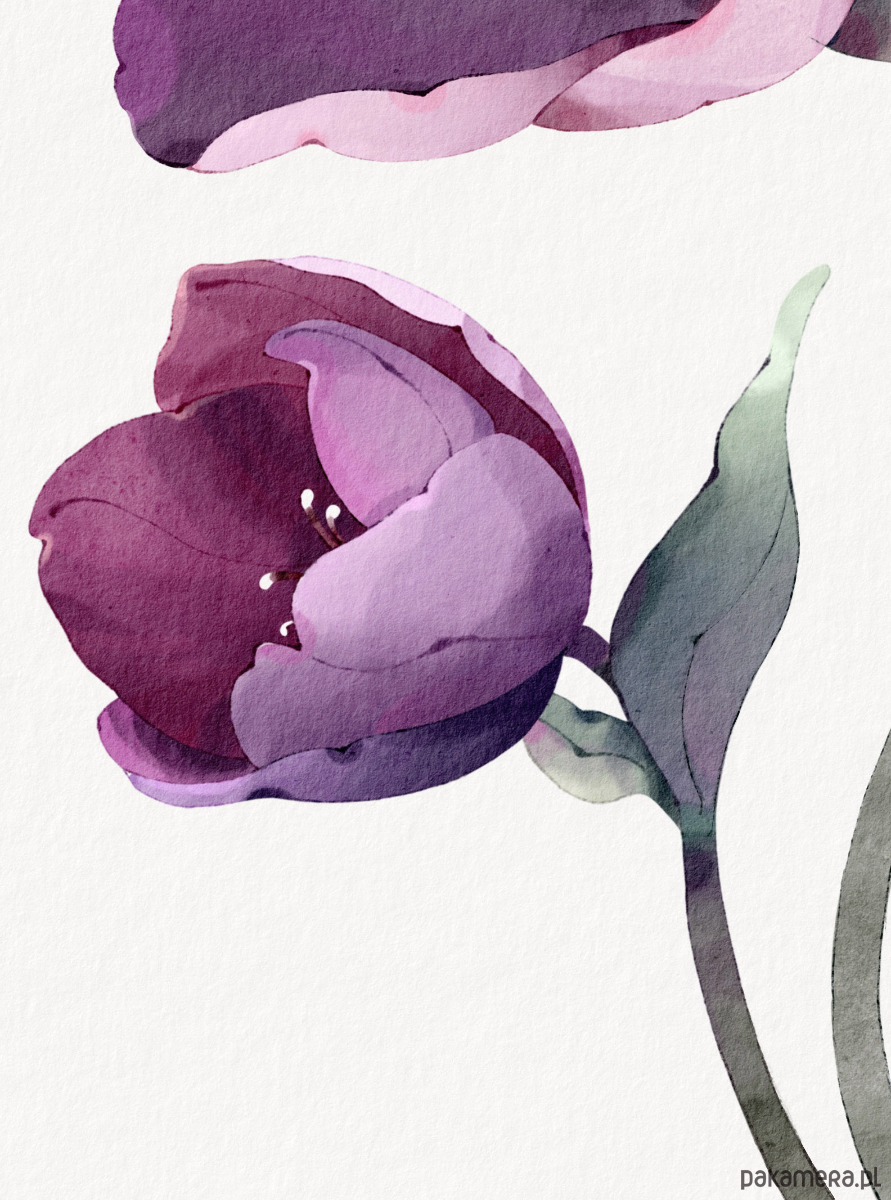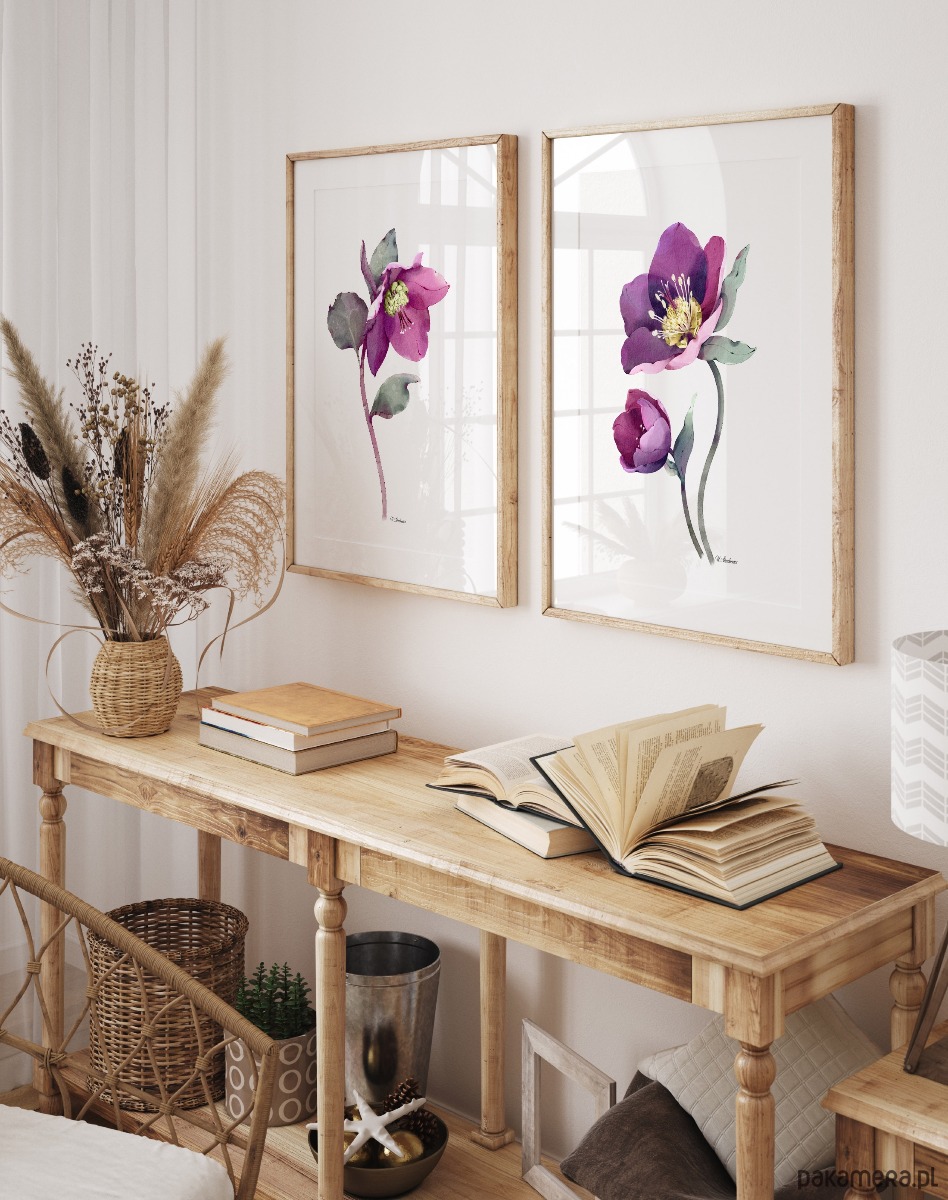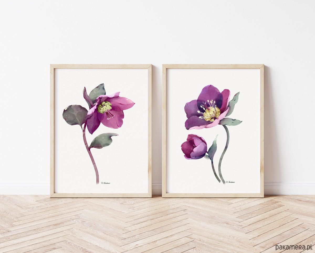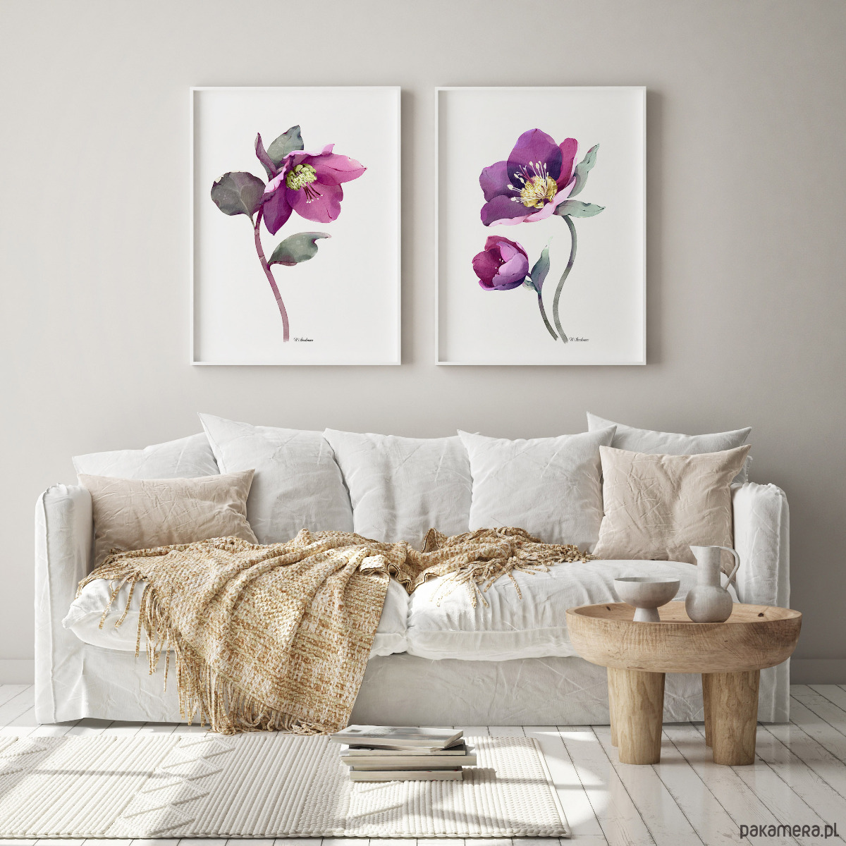 Dwie uzupełniające się ilustracje — idealny komplet do powieszenia obok siebie. Głęboka fioletowo-burgundowa paleta doskonale ożywia białe ściany i pasuje do wnętrz skandynawskich, modern classic i boho. Piękna dekoracja salonu, sypialni lub gabinetu. Elegancki pomysł na prezent — urodziny, imieniny, parapetówka, Dzień Matki.