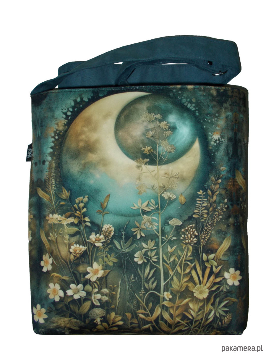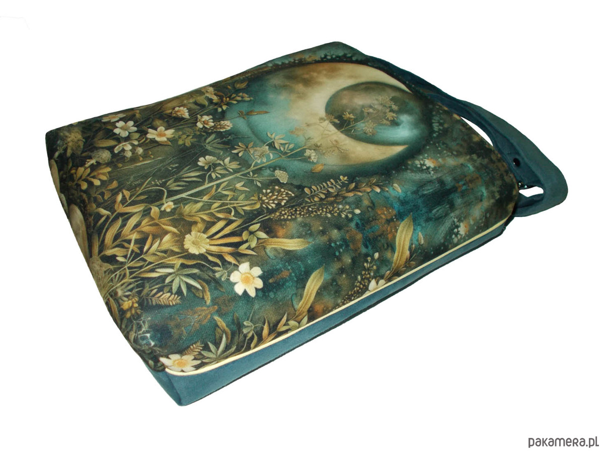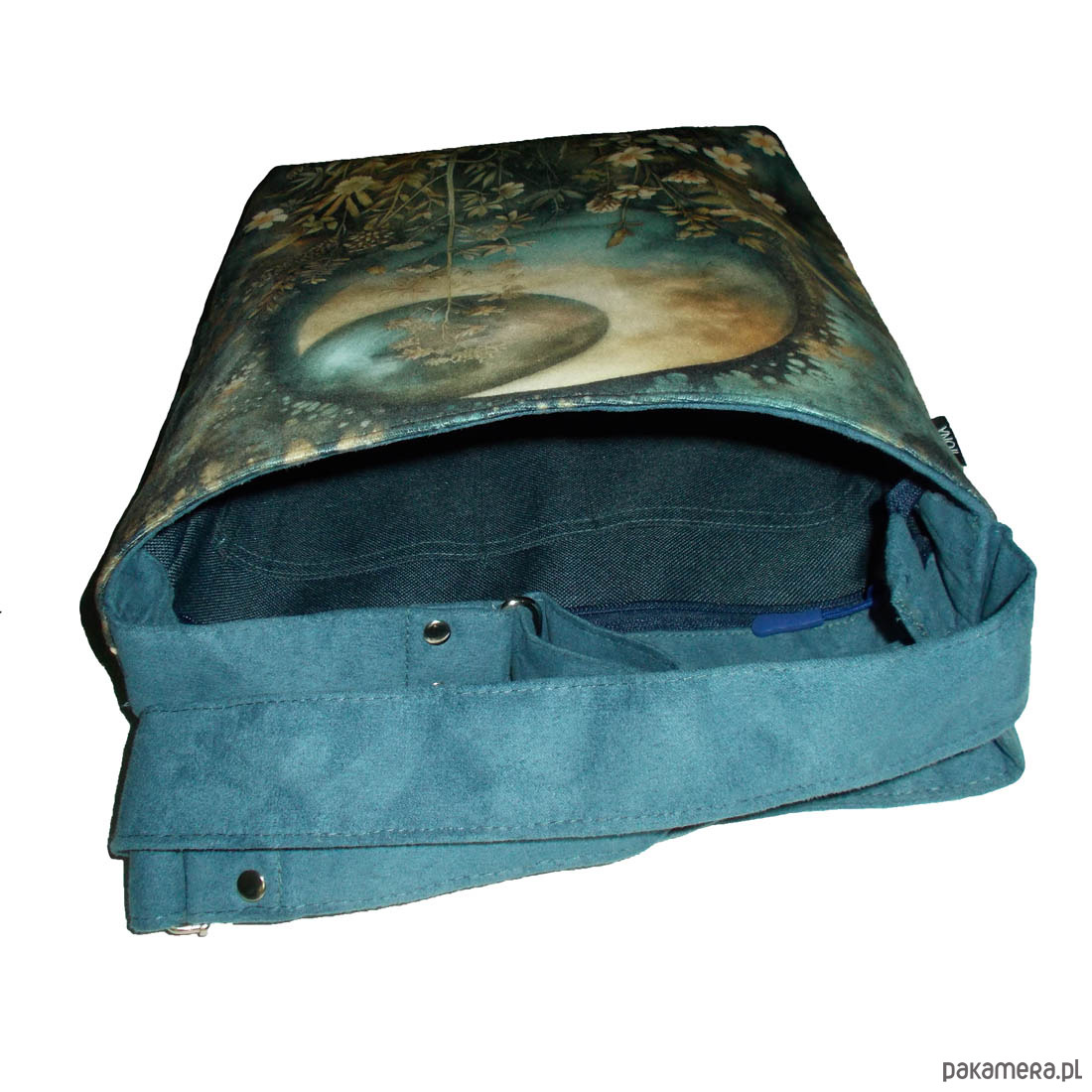 Autorska torba z usztywnionego eko zamszu, zapinana na zamek. Przód z weluru tapicerskiego. Pasek regulowany. Tył w korze paska (niebieski) Torba trzyma fason. Wewnątrz dwie kieszenie - jedna na zamek, druga z miejscem na telefon i coś jeszcze. W szwach wypustka. Denko poszerzone. szerokość 32cm wysokość 30cm plus denko 8cm
