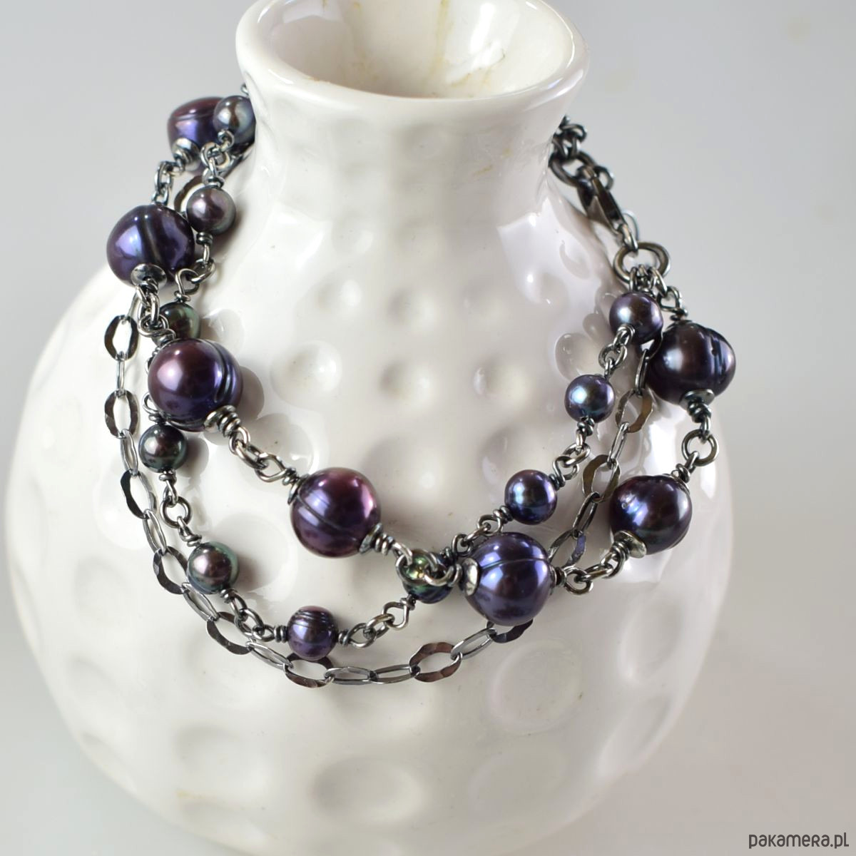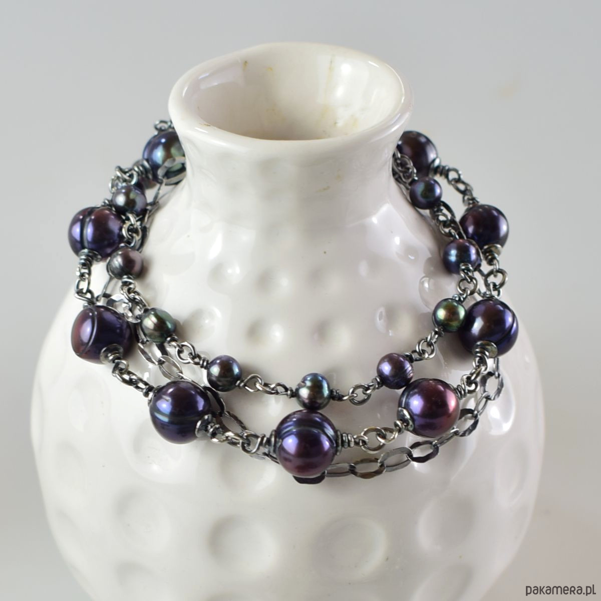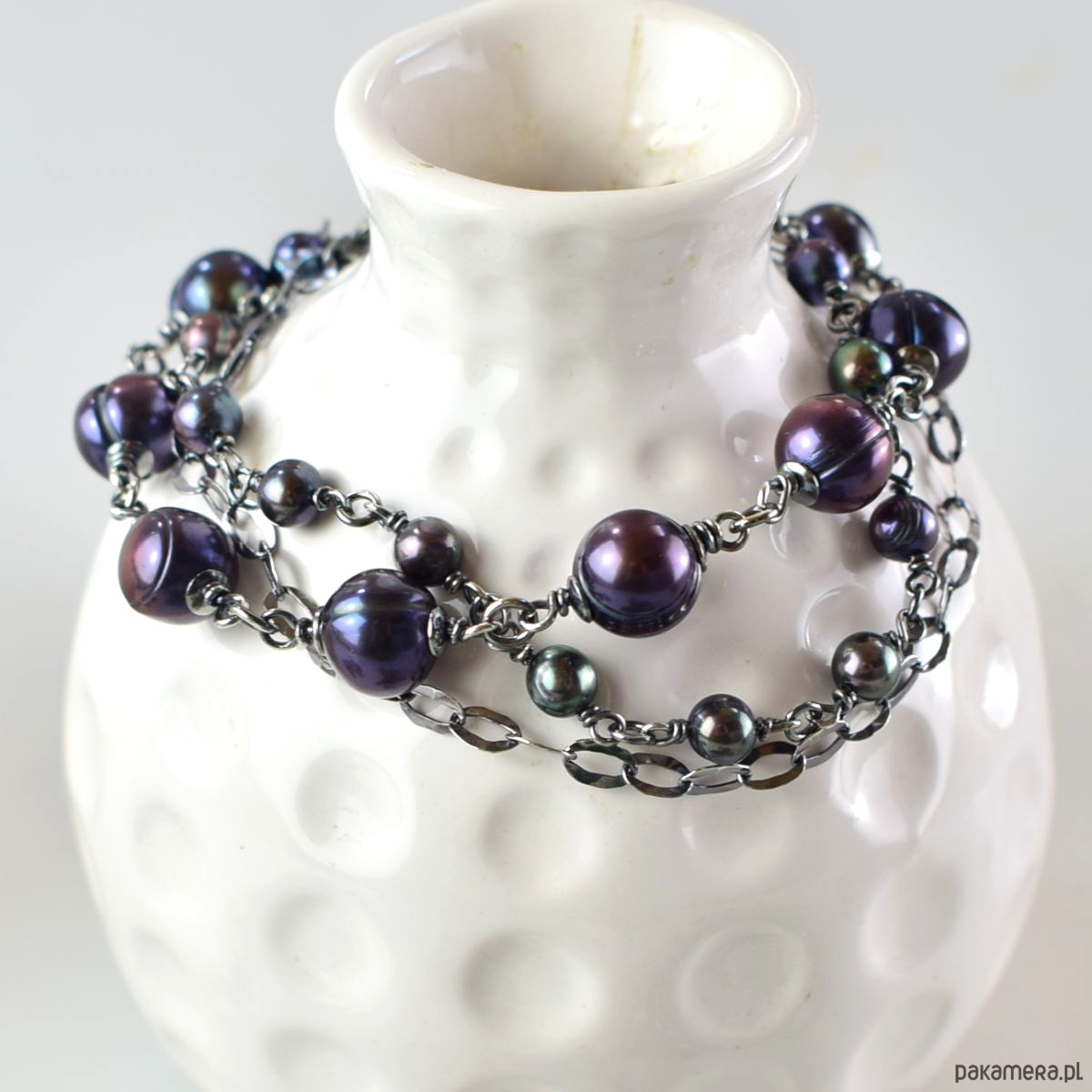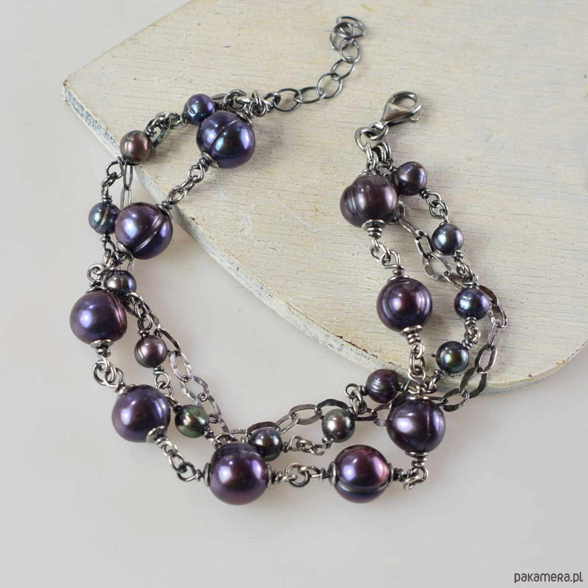 Bransoletka wykonana w całości ze srebra (próba 925) z perłami. Całość została zoksydowana (przyciemniona) i wypolerowana. Długość regulowana 21 - 25 cm. Biżuteria zostanie ozdobnie zapakowana.