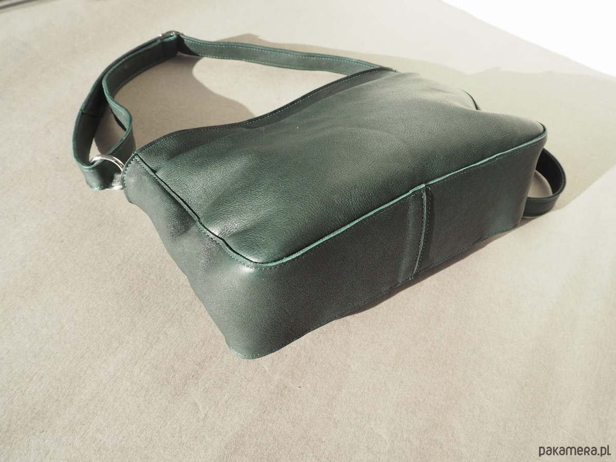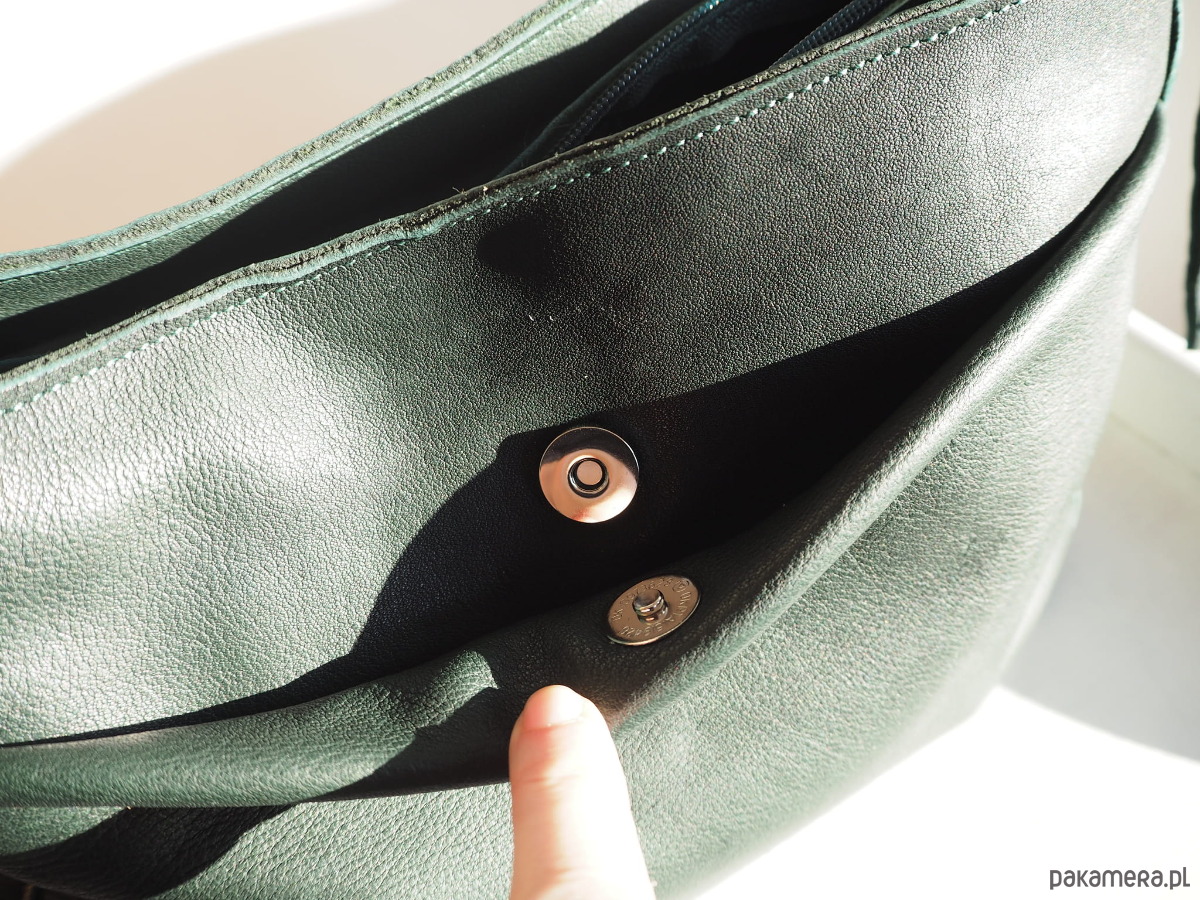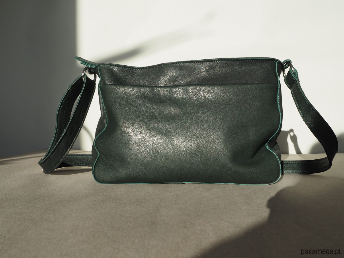 Ciemno zielona skórzana torebka. Z przodu duża kieszonka zzapięciem na magnes.