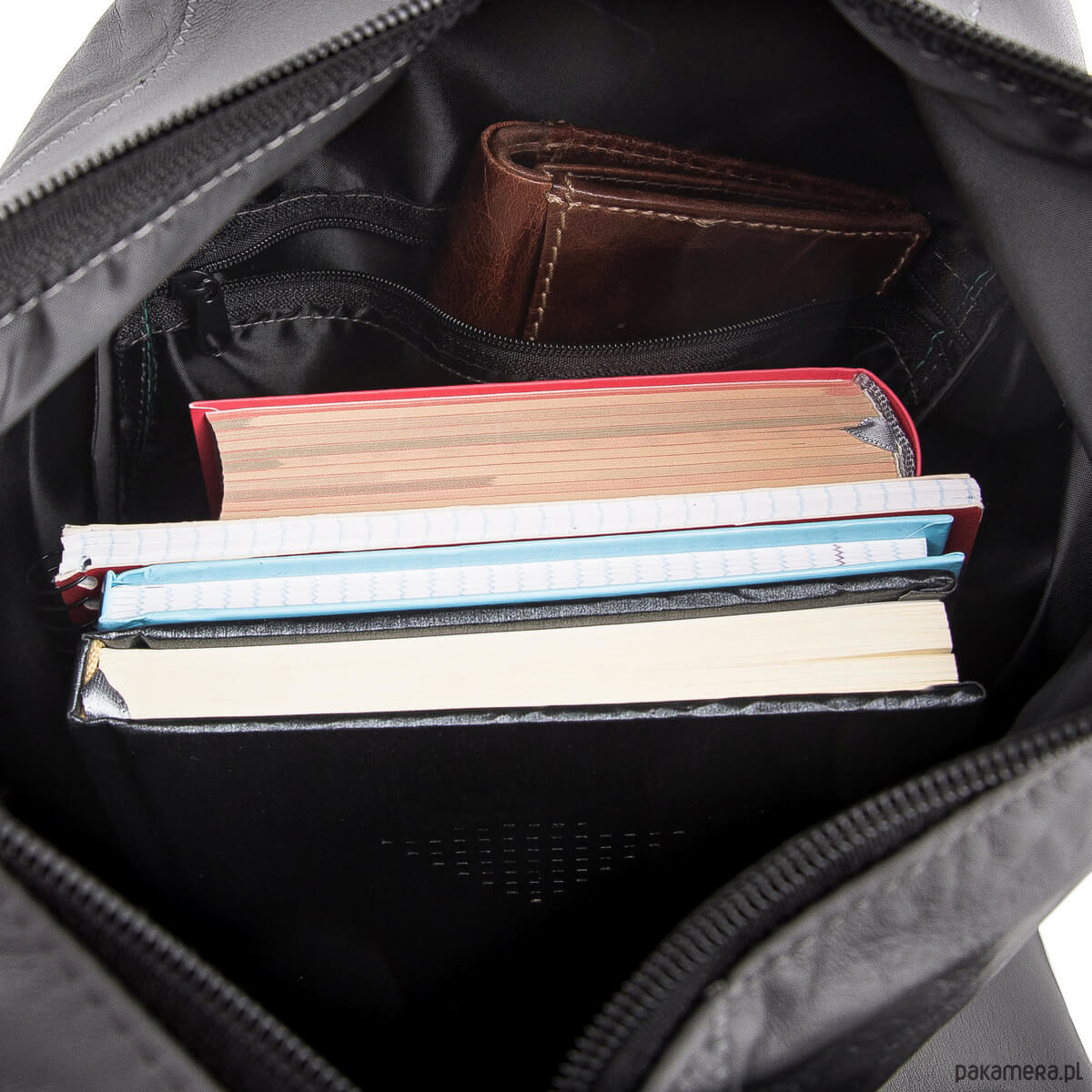 - główna komora mieści format A4, wyposażone jest w małą 1 kieszonkę zamykaną zamkiem na damską portmonetkę.