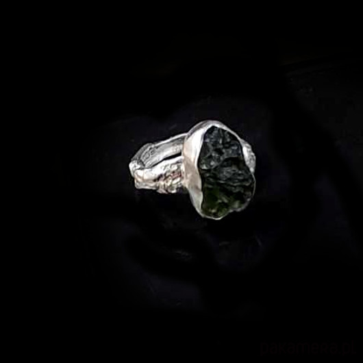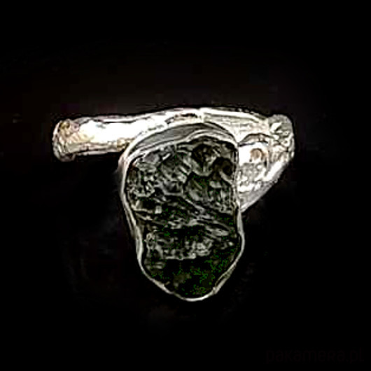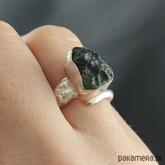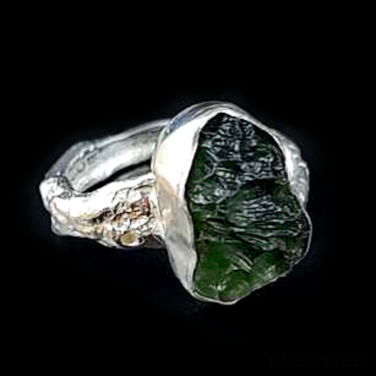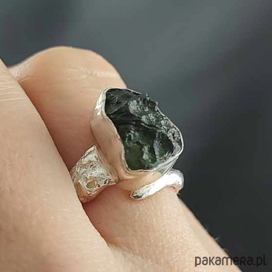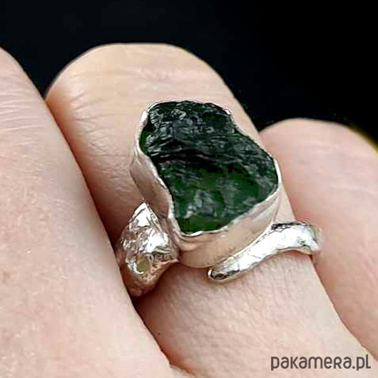 Surowy pierścień z oprawiony w srebro pr. 925 okazem przejrzystego, pięknego mołdawitu. Mołdawit lub inaczej wełtawit to rodzaj tektytu,który pochodzi z krateru meteorytowego o nazwie Ries na południu Niemiec. Wymiary oprawy 14 X 11 mm. Waga 6 g. Rozmiar jubilerski regulowany, po zakupie mogę dopasowac na konkretny. Pierścionek zostanie wysłany w ozdobnym pudełeczku.