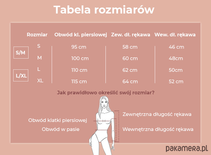 Modelka ma na sobie rozmiar S/M. Wymiary modelki: wzrost 174 cm, biust 83 cm, talia 62 cm, biodra 91 cm.