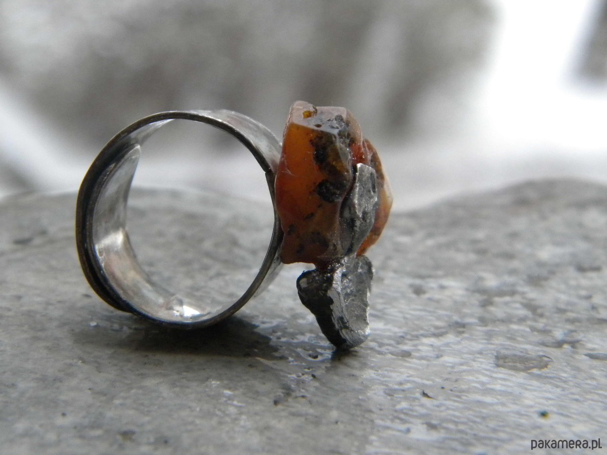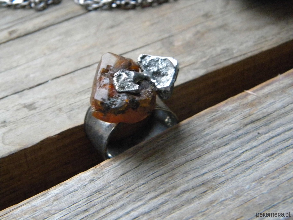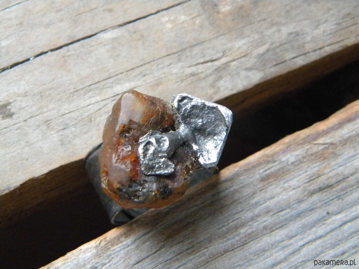 surowo oszlifowany bursztyn oprawiony w ocynowaną miedz.