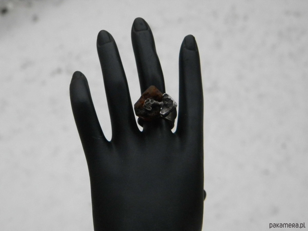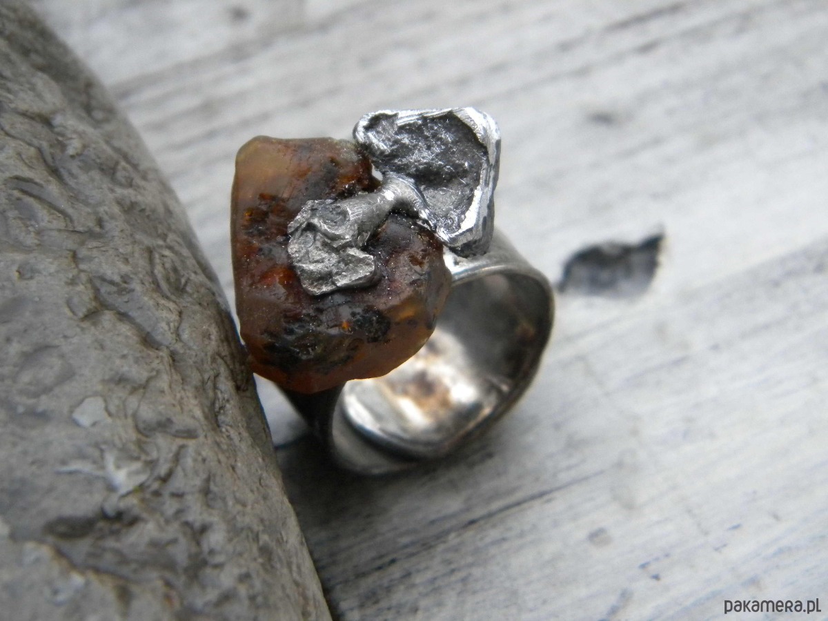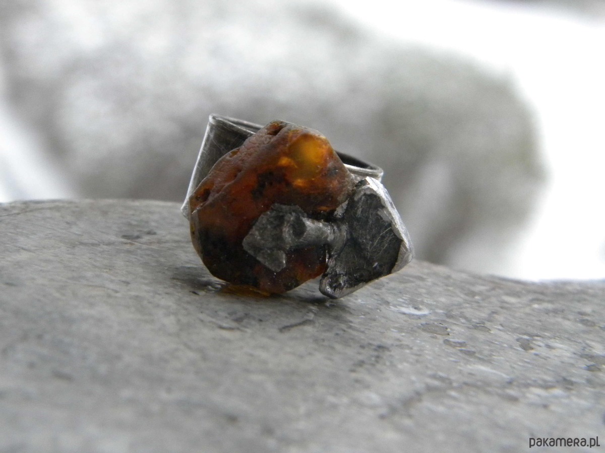surowo oszlifowany bursztyn oprawiony w ocynowaną miedz.