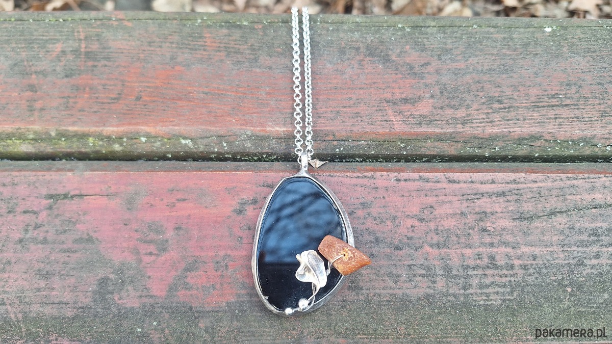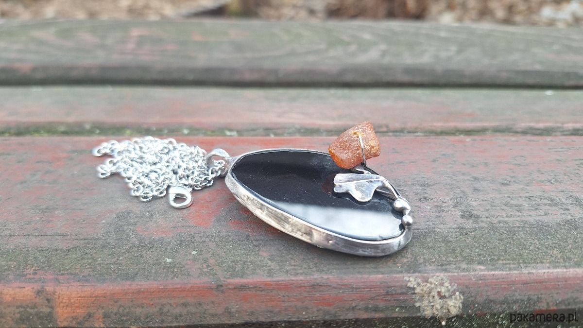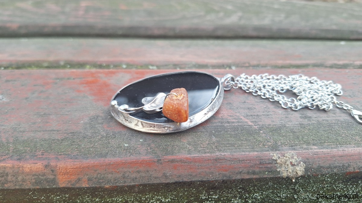 Wisiorek wykonany z miedzi, cyny, bursztynu i agatu. Wymiary ok. 5.5 na 3.5 cm. Zawieszony na łańcuszku o długości ok. 50 cm.
