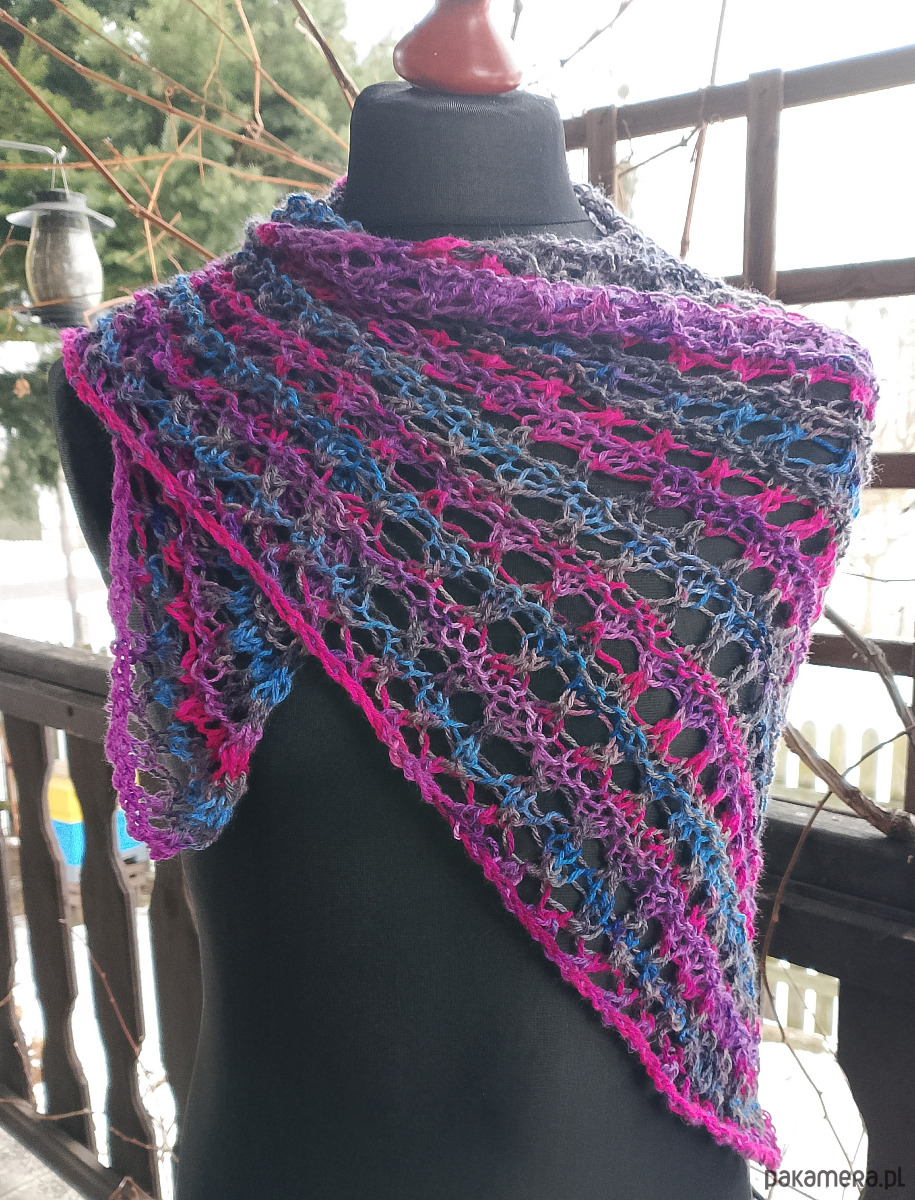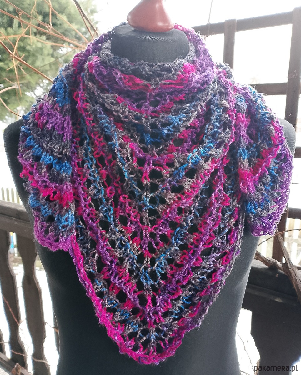 Nieduża cieniowana chusta wykonana w całości ręcznie na drutach z miłej w dotyku włóczki akrylowej. Ażurowy wzór sprawia, że chusta jest lekka, rozciągliwa, a przy tym ciepła. Doda uroku każdej stylizacji.