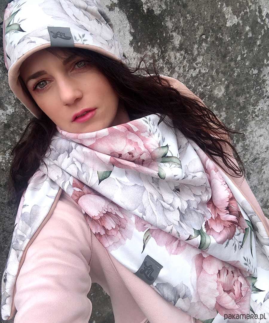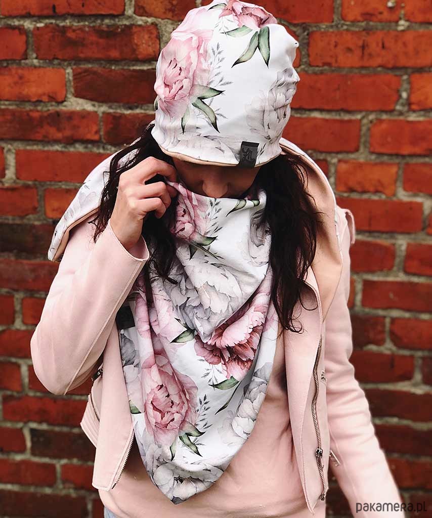 Cienka czapka damska z dużą chustą w kwiaty piwonie