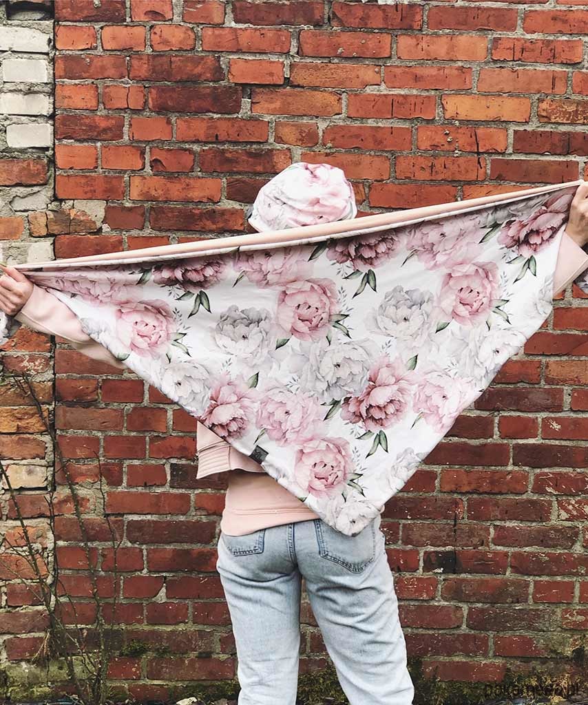 Czapka wiosenna damska z dużą chustą w kwiaty piwonie komplet jest uszyta z mięciutkiej polskiej bawełny z certyfikatami i świetnie dopełni Twoją wiosenną stylizację . Komplet czapka i chusta damska pieknie prezentował się będzie do lekkich wiosennych płąszczyków czy jeansowych kurtek .