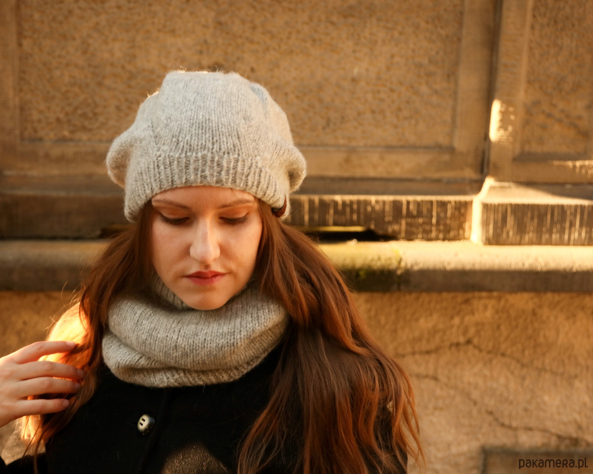 Modelka pozuje w kolorze camelowym. Komin stworzy komplet z jasnoszarą czapką beretową z alpaki.