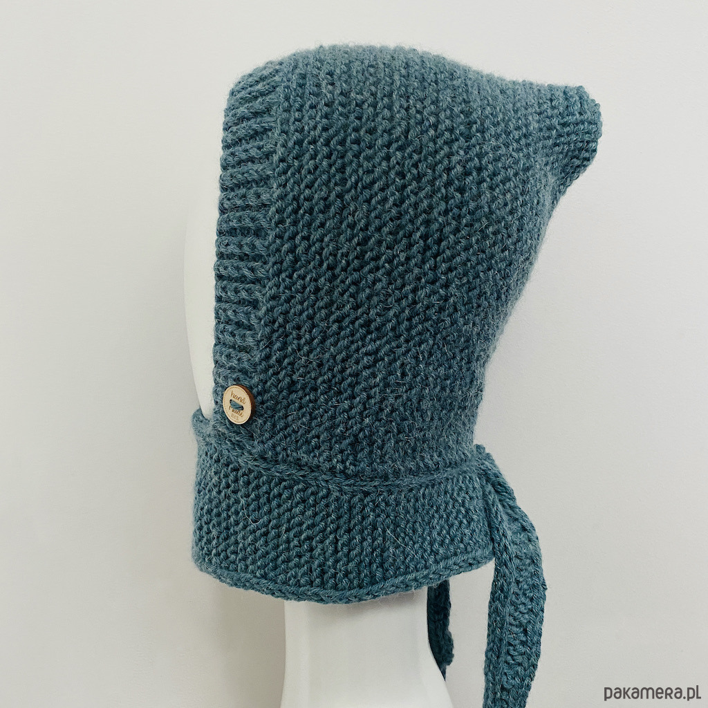 Kaptur wykonałam ręcznie na drutach z wysokiej jakości norweskiej włóczki która w składzie ma 65% Peruvian Highland wool i 35% superfine alpaca. Włókna są tylko myte i nie są narażone na kontakt z obróbką chemiczną przed barwieniem. Podkreśla to naturalne właściwości przędzy, a to zapewnia lepszy kształt i jakość tekstury.