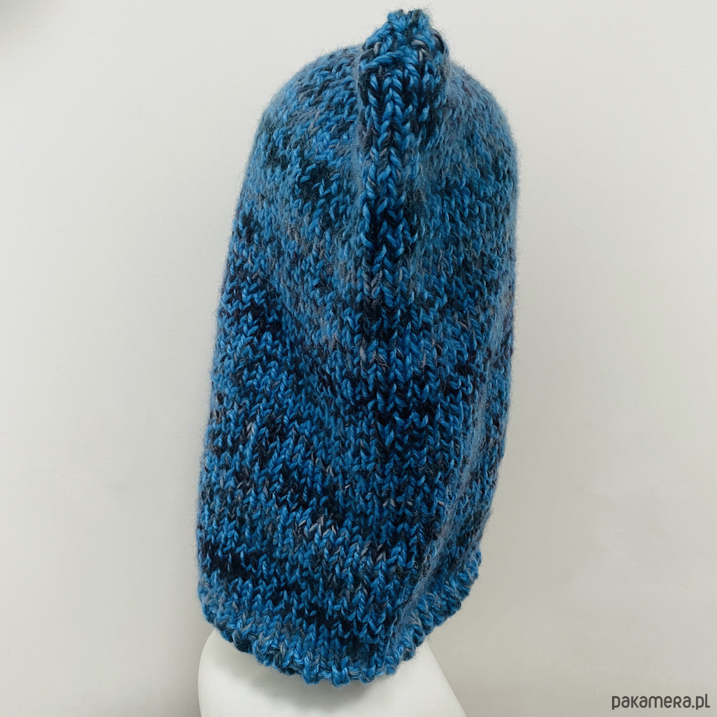 Kominiarkę oversize wykonałam ręcznie na drutach z dwóch rodzajów włóczki. Pierwsza to 100% miękkiej wełny, druga to mieszanka akrylu z wełną, która zwiększa trwałość dzianiny.