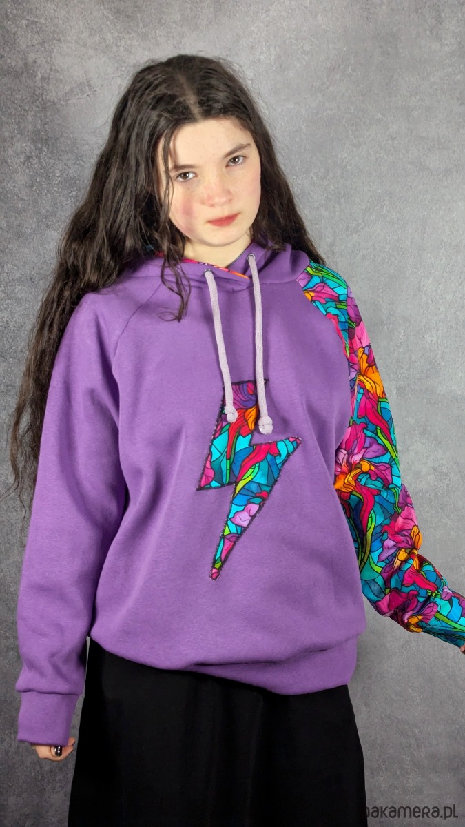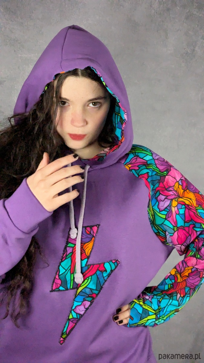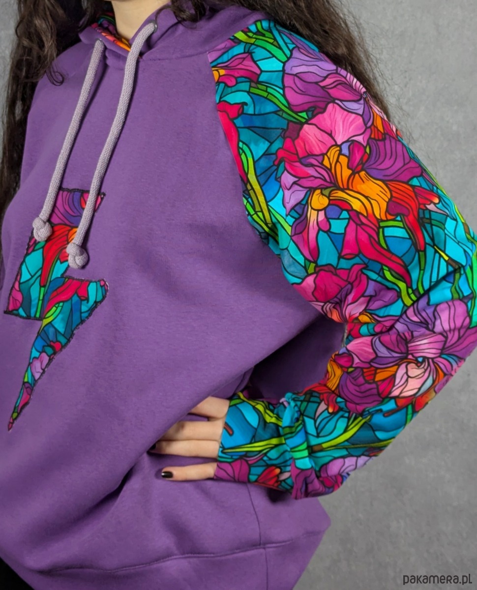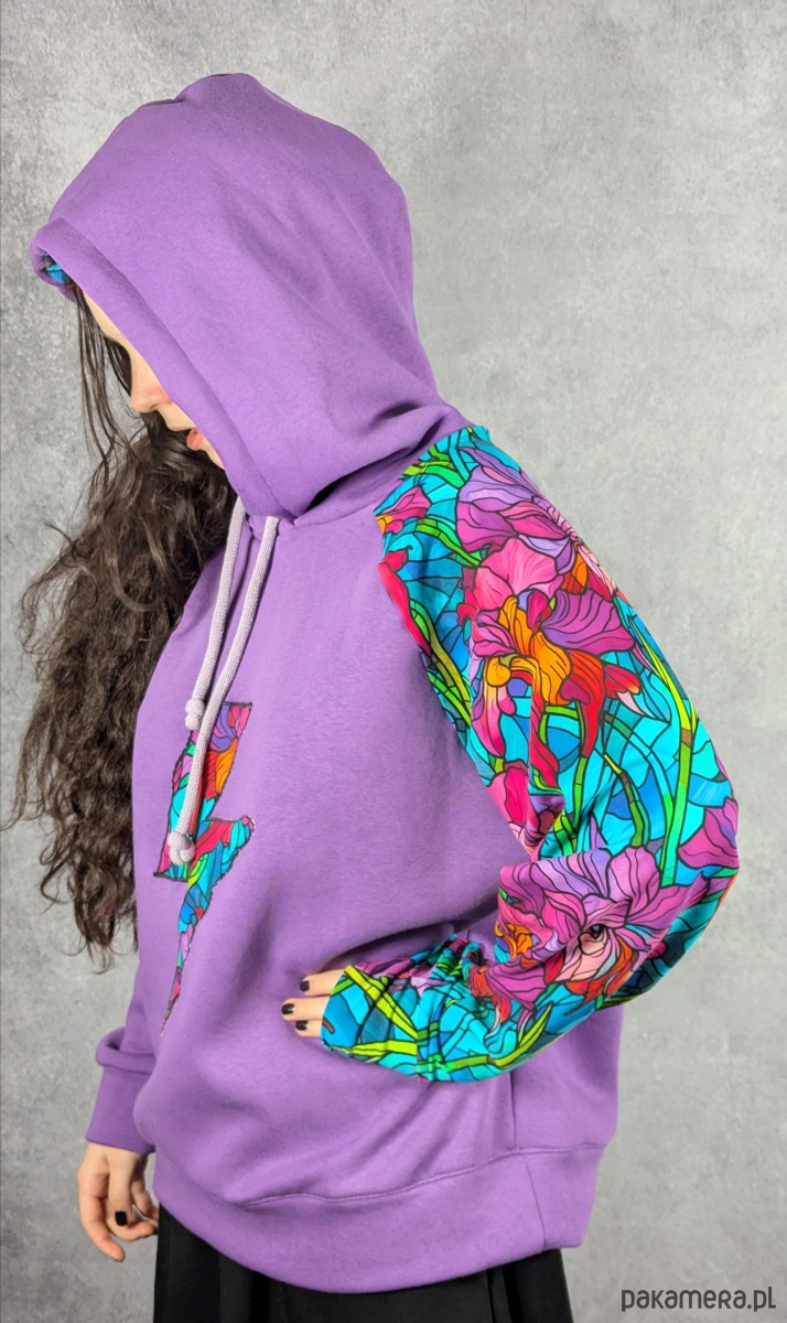Bluza została uszyta z cieplutkiej, doskonałej jakości fioletowej dresówki z meszkiem od środka, dzięki czemu jest bardzo przyjemna w noszeniu i świetnie sprawdza się w chłodniejsze dni. Rękaw oraz wnętrze kaptura wykonane są z cieńszej dresówki cyfrowej w piękny witrażowy wzór z irysami, co tworzy ciekawy kontrast i nadaje całości artystycznego charakteru.