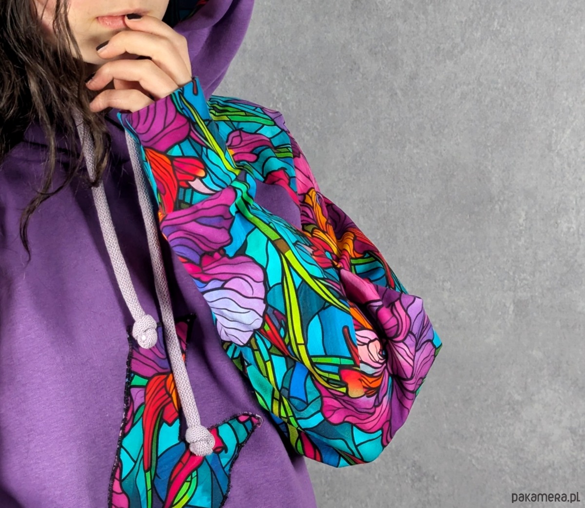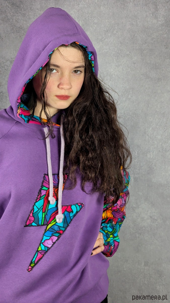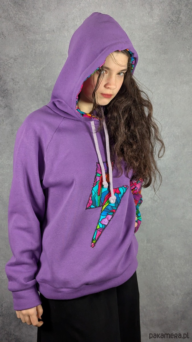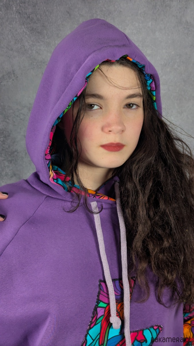 Bluza została uszyta z cieplutkiej, doskonałej jakości fioletowej dresówki z meszkiem od środka, dzięki czemu jest bardzo przyjemna w noszeniu i świetnie sprawdza się w chłodniejsze dni. Rękaw oraz wnętrze kaptura wykonane są z cieńszej dresówki cyfrowej w piękny witrażowy wzór z irysami, co tworzy ciekawy kontrast i nadaje całości artystycznego charakteru.