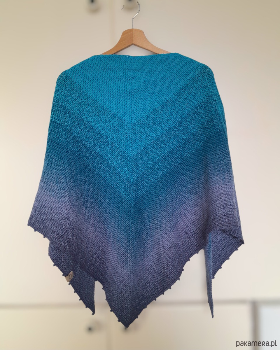 Ręcznie wykonana chusta o płynnym przejściu kolorów od nasyconego turkusu przez petrol aż po głęboki granat. Szlachetne, chłodne barwy nadają jej elegancji i sprawiają, że pięknie układa się na ramionach.