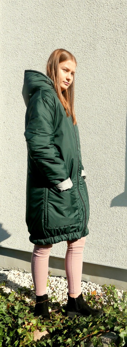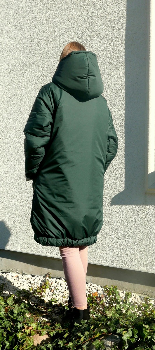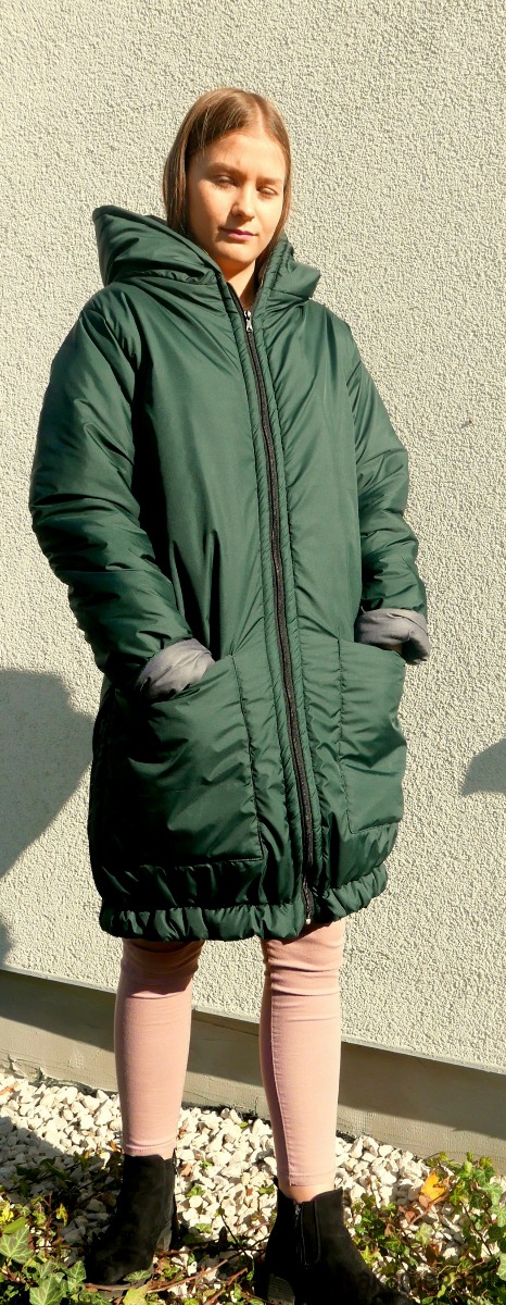 Ciepła długa kurtka z kapturem impregnowana w kolorze zieleni butelkowej zapinana na suwak