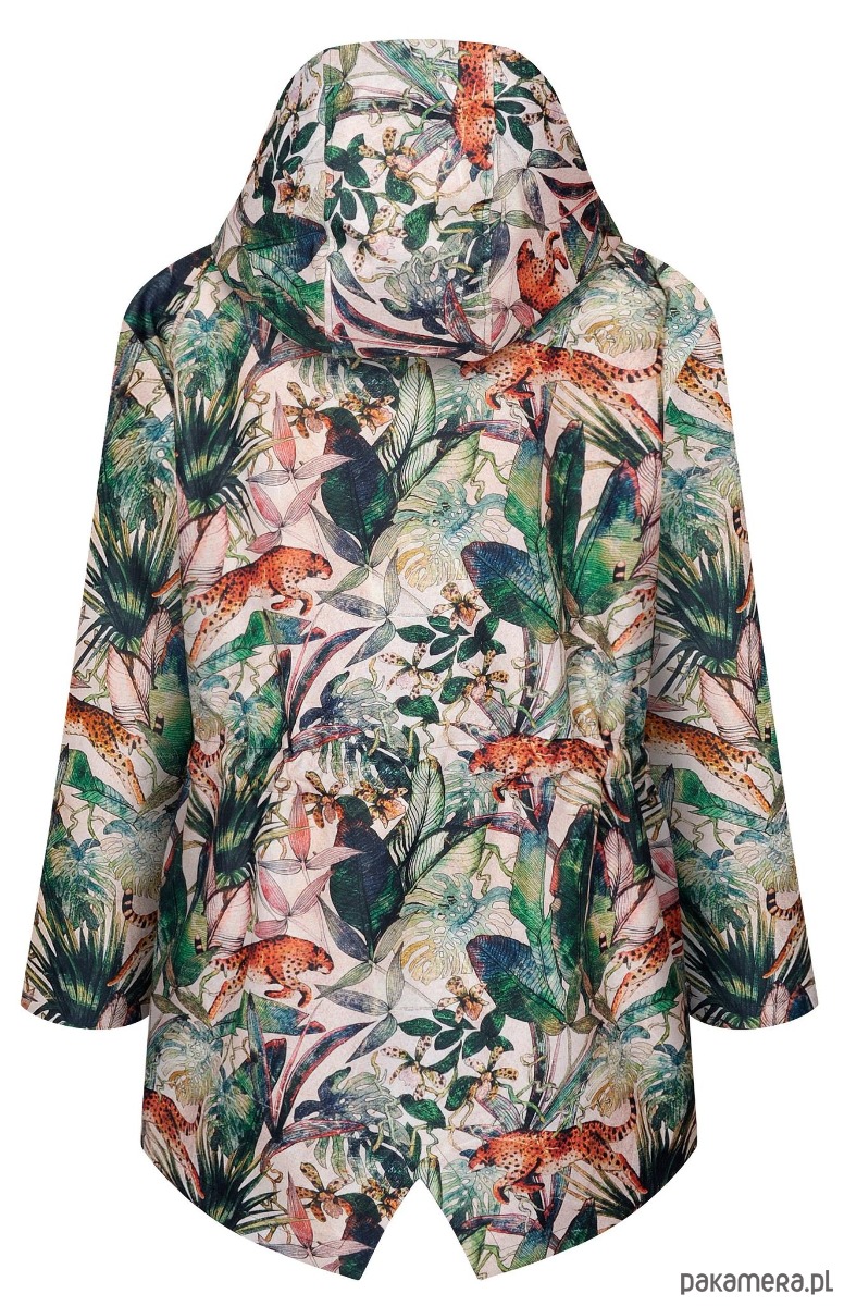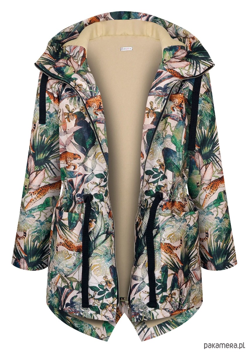 Przepiękna, jesienna parka z kapturem i dużymi kieszeniami.W pasie wszyty tunel który można ściągnąć dla lepszego ocieplenia. Płaszcz ocieplony, zastosowana podszewka to dzianina dresowa drapana w stu procentach bawełniana, oddychająca. Parka idealna na jesień jak i na zimę. Przepiękny print przykuwający uwagę.