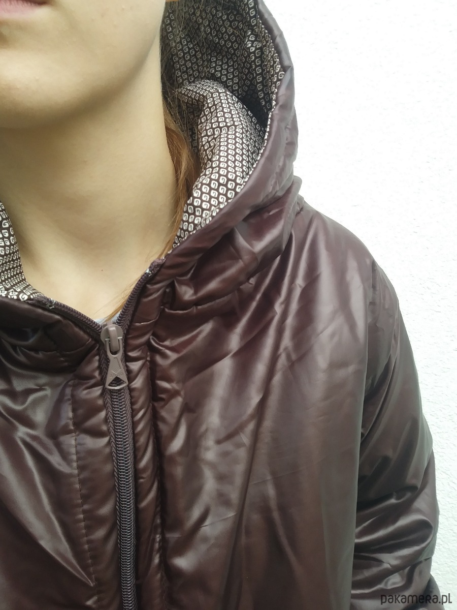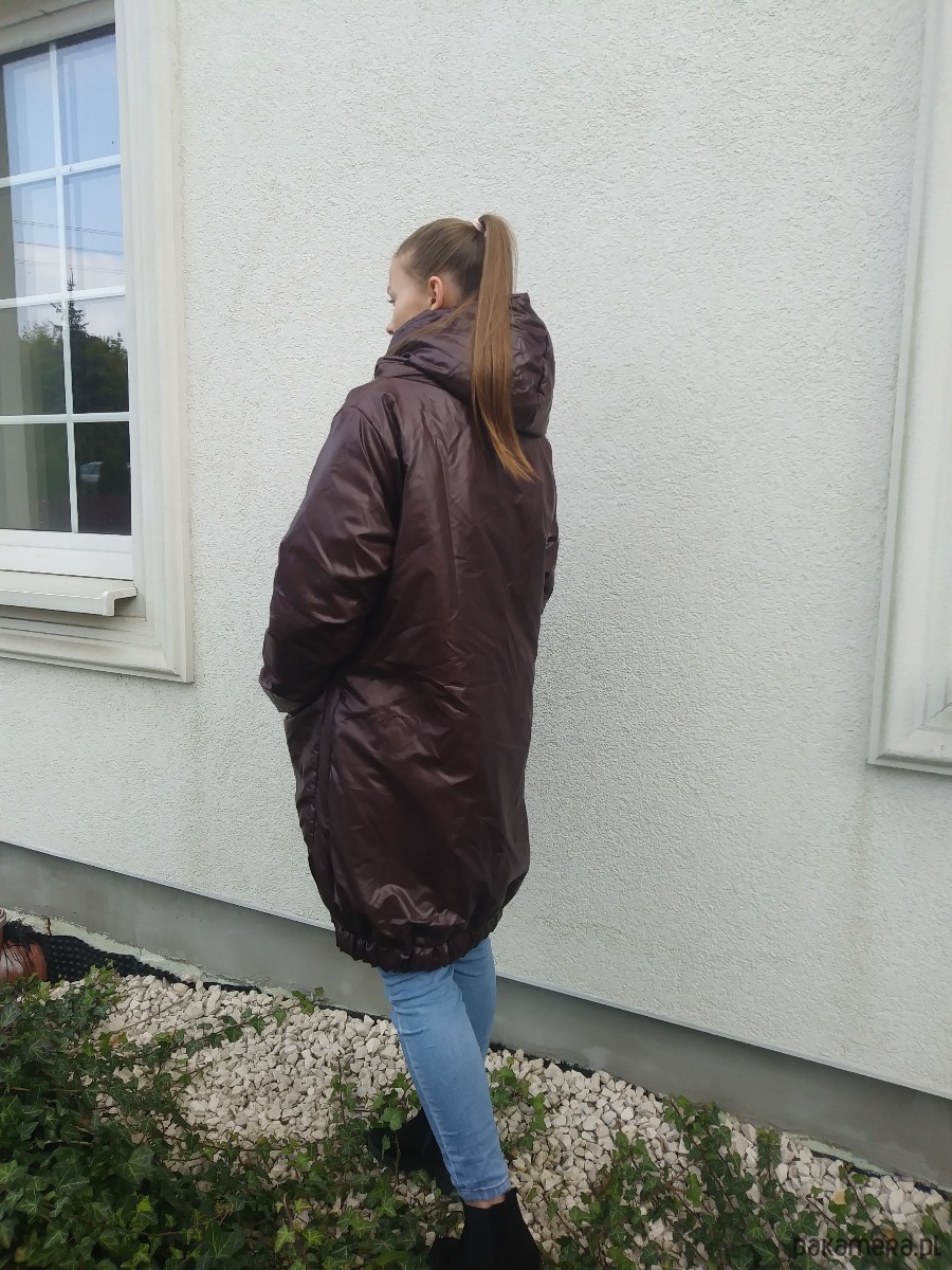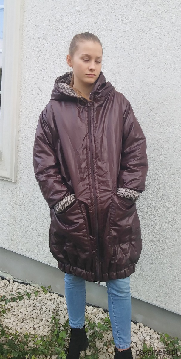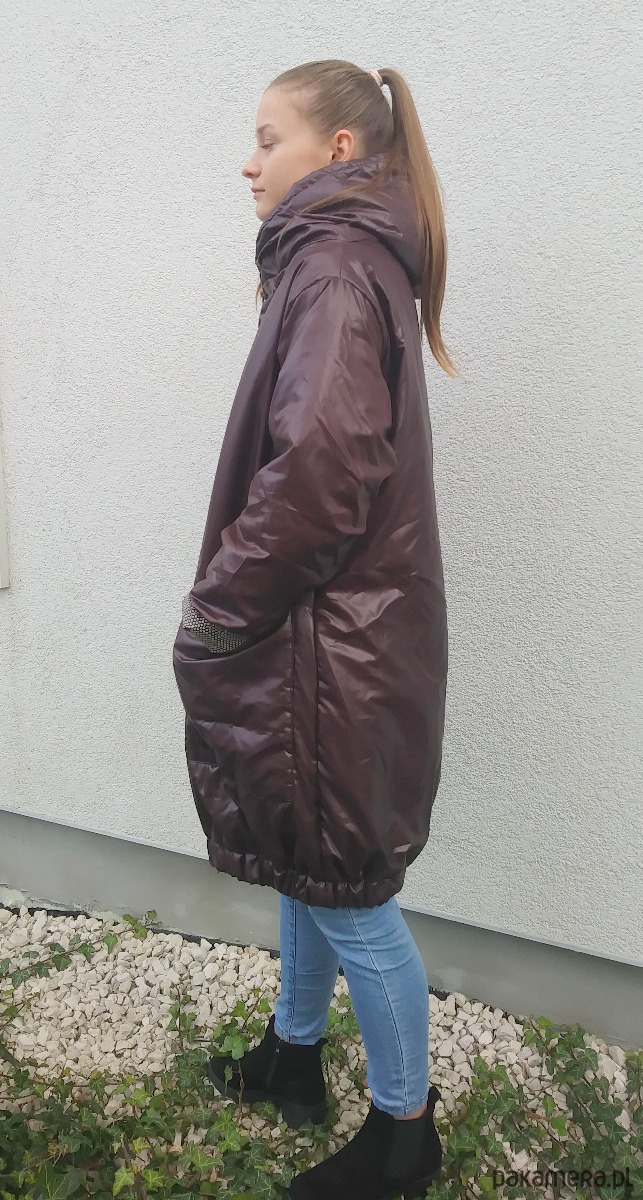 Ciepła lekka długa kurtka z kapturem impregnowana brązowa zapinana na suwak