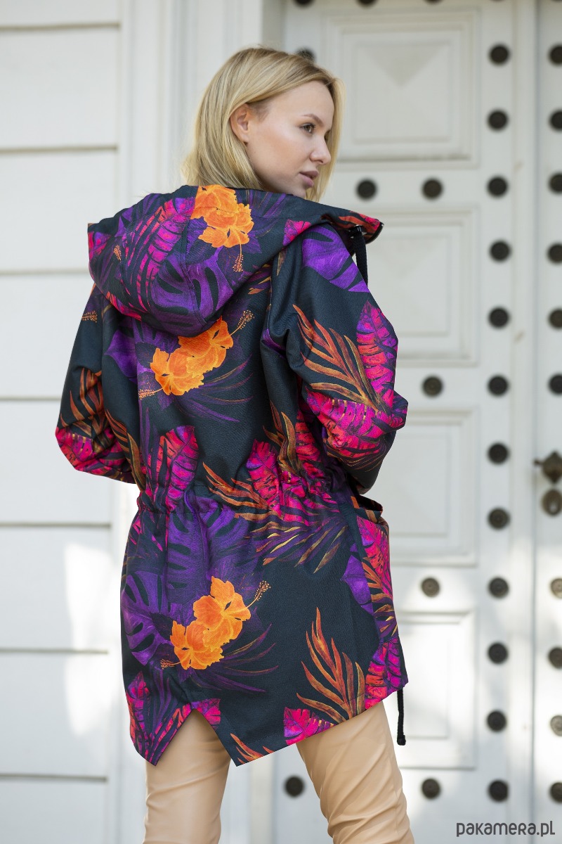 Przepiękna, jesienna parka z kapturem i dużymi kieszeniami.W pasie wszyty tunel który można ściągnąć dla lepszego ocieplenia. Płaszcz ocieplony, zastosowana podszewka to dzianina dresowa drapana w stu procentach bawełniana, oddychająca. Parka idealna na jesień jak i na zimę. Przepiękny print przykuwający uwagę.