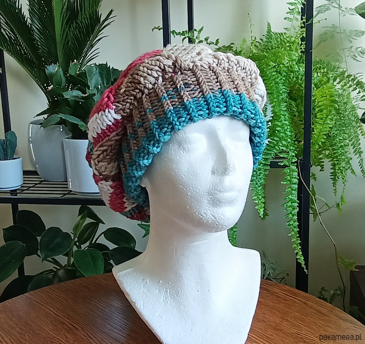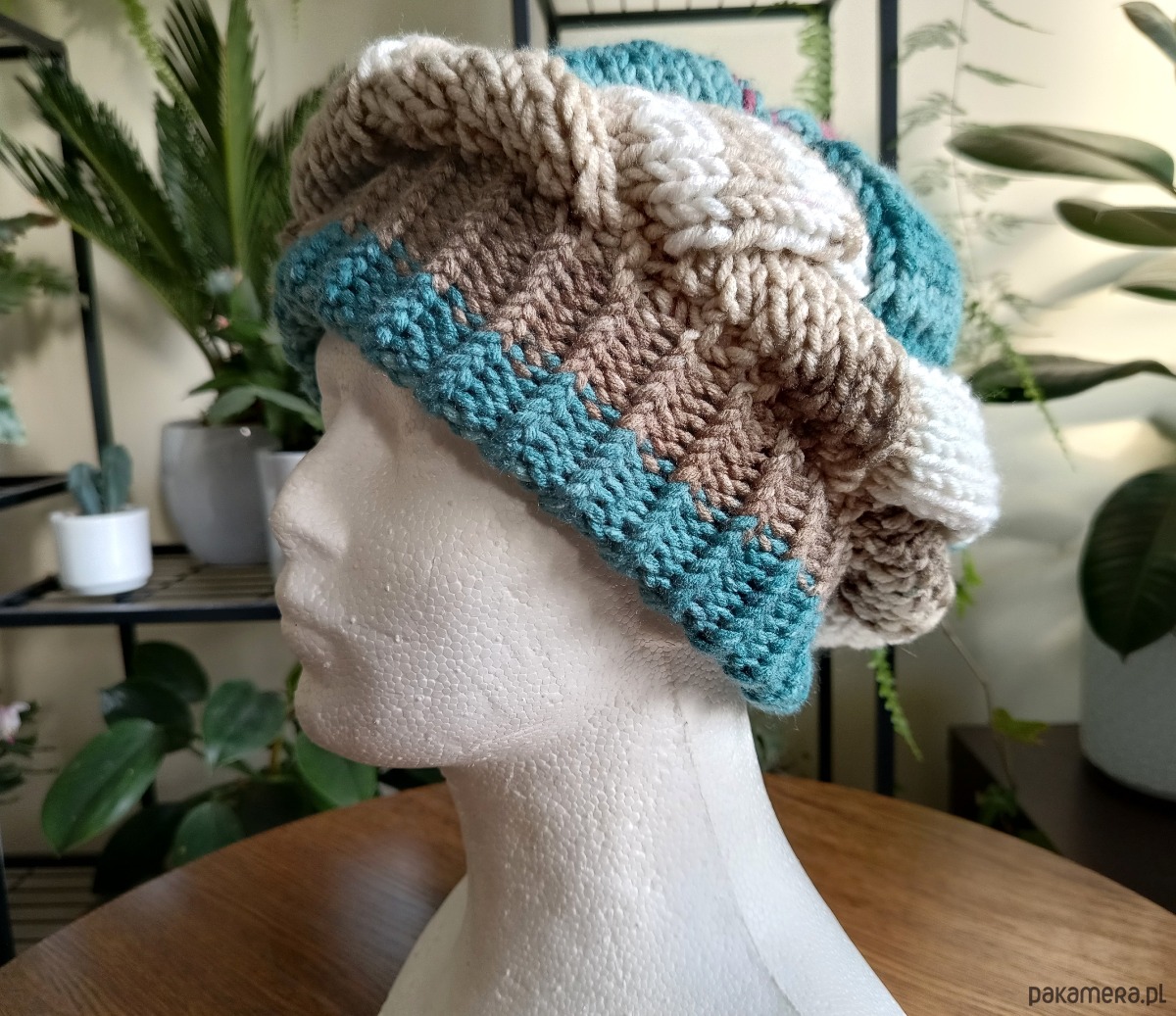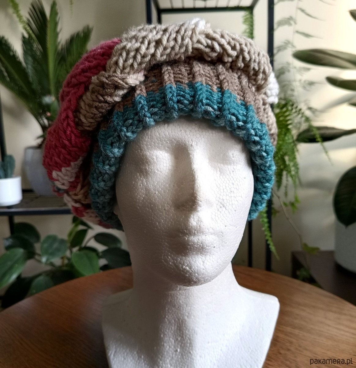 Beret jest obszerny i luźny, można go nosić na wiele sposobów.
