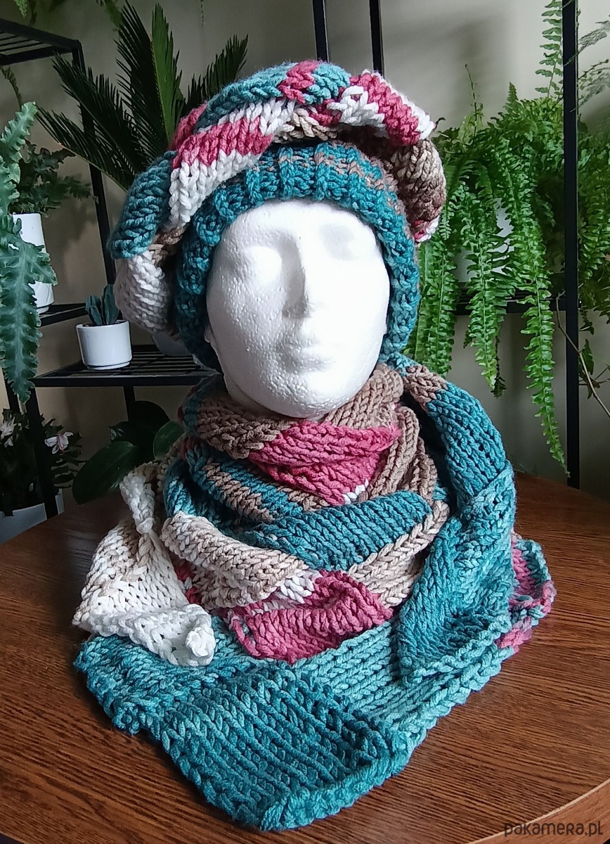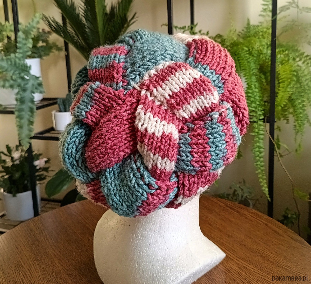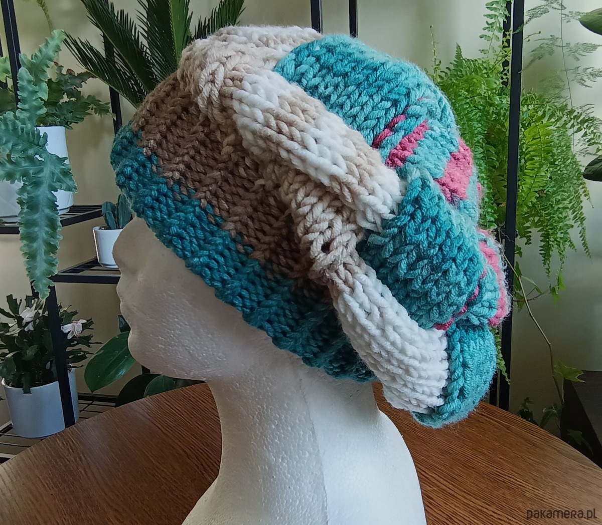 Beret jest obszerny i luźny, można go nosić na wiele sposobów.