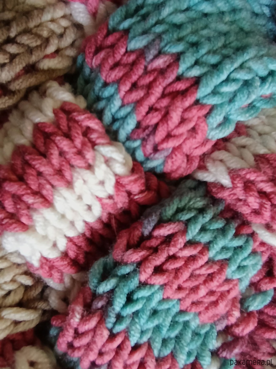 Czapkę wydziergałam z ciepłej, miłej w dotyku włóczki. Wzór o grubym splocie powoduje, że czapka jest miękka i sprężysta. "Nie gryzie":)