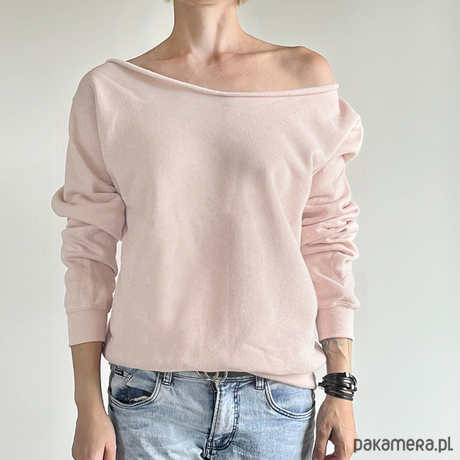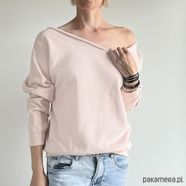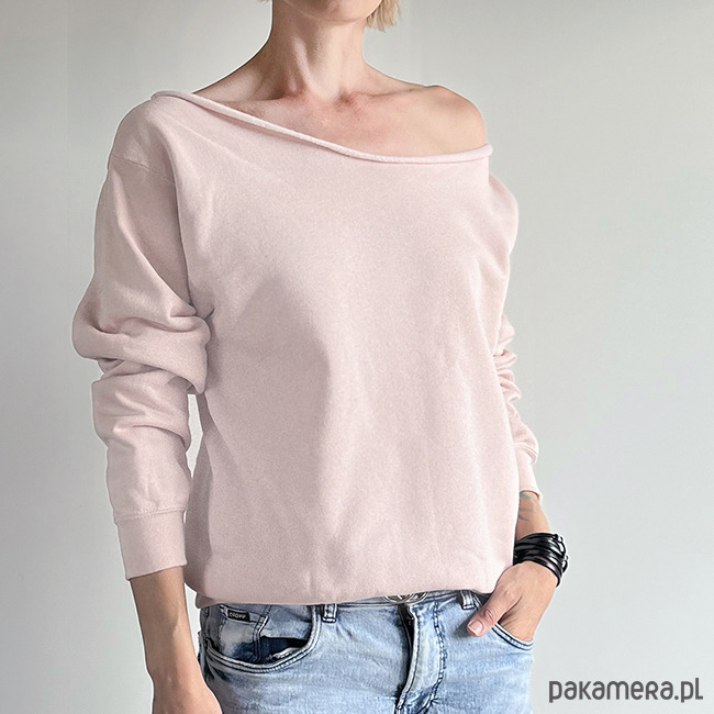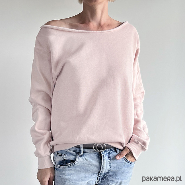 Oversize. Bluza 80% bawełny, 20% poliestru. Od lewej strony miękki meszek. Surowe wykończenie dzianiny, materiał jest lekko szorstki.