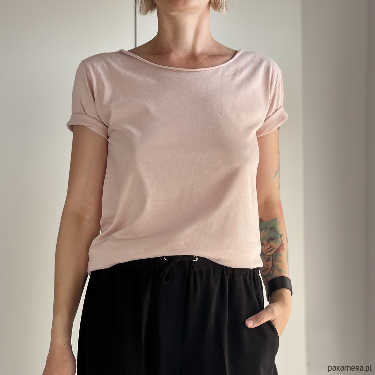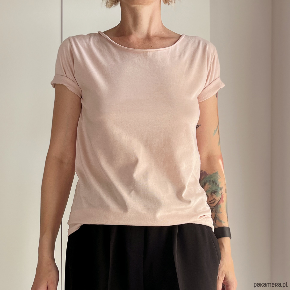 Gładki tshirt z ciętym dekoltem w odcieniu ciepłego różu. Taki lekko cielisty, lekko różowy, lekki krem-beż-róż.