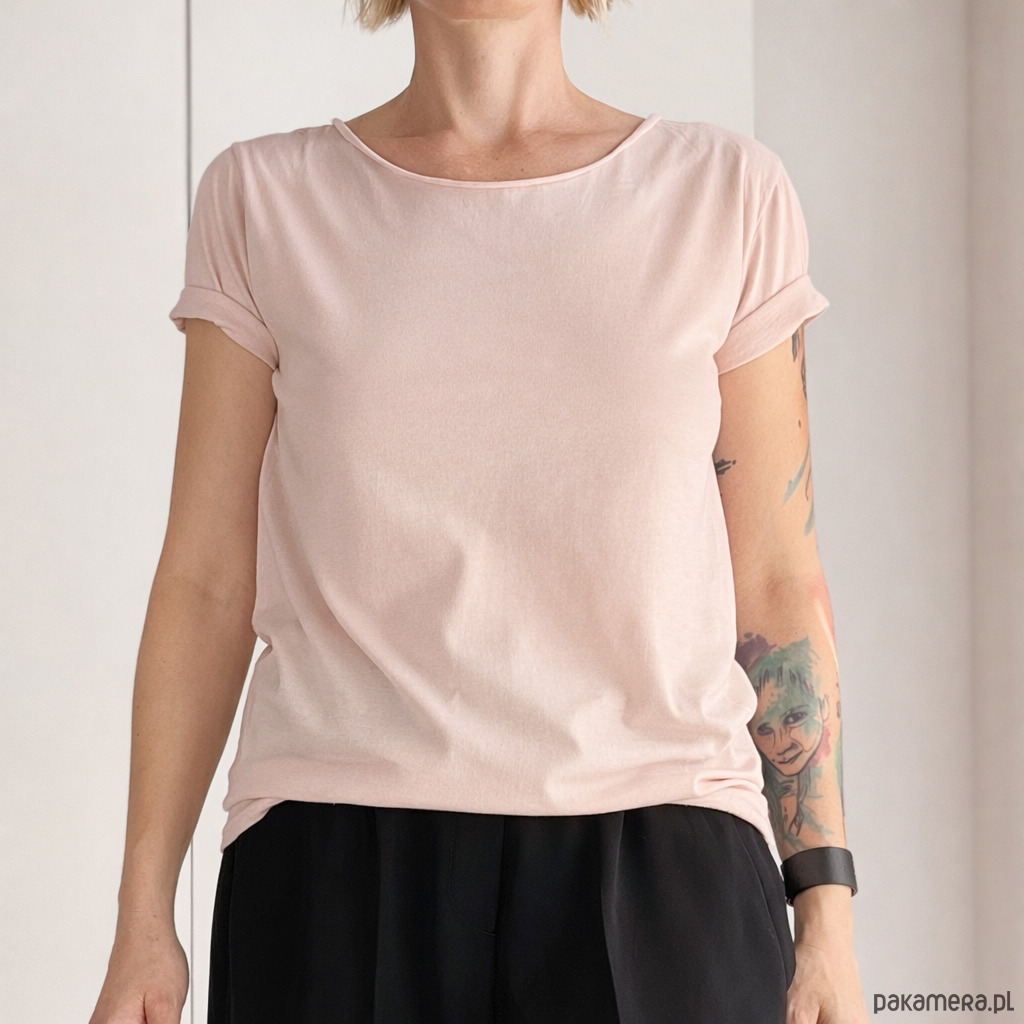 Gładki tshirt z ciętym dekoltem w odcieniu ciepłego różu. Taki lekko cielisty, lekko różowy, lekki krem-beż-róż.