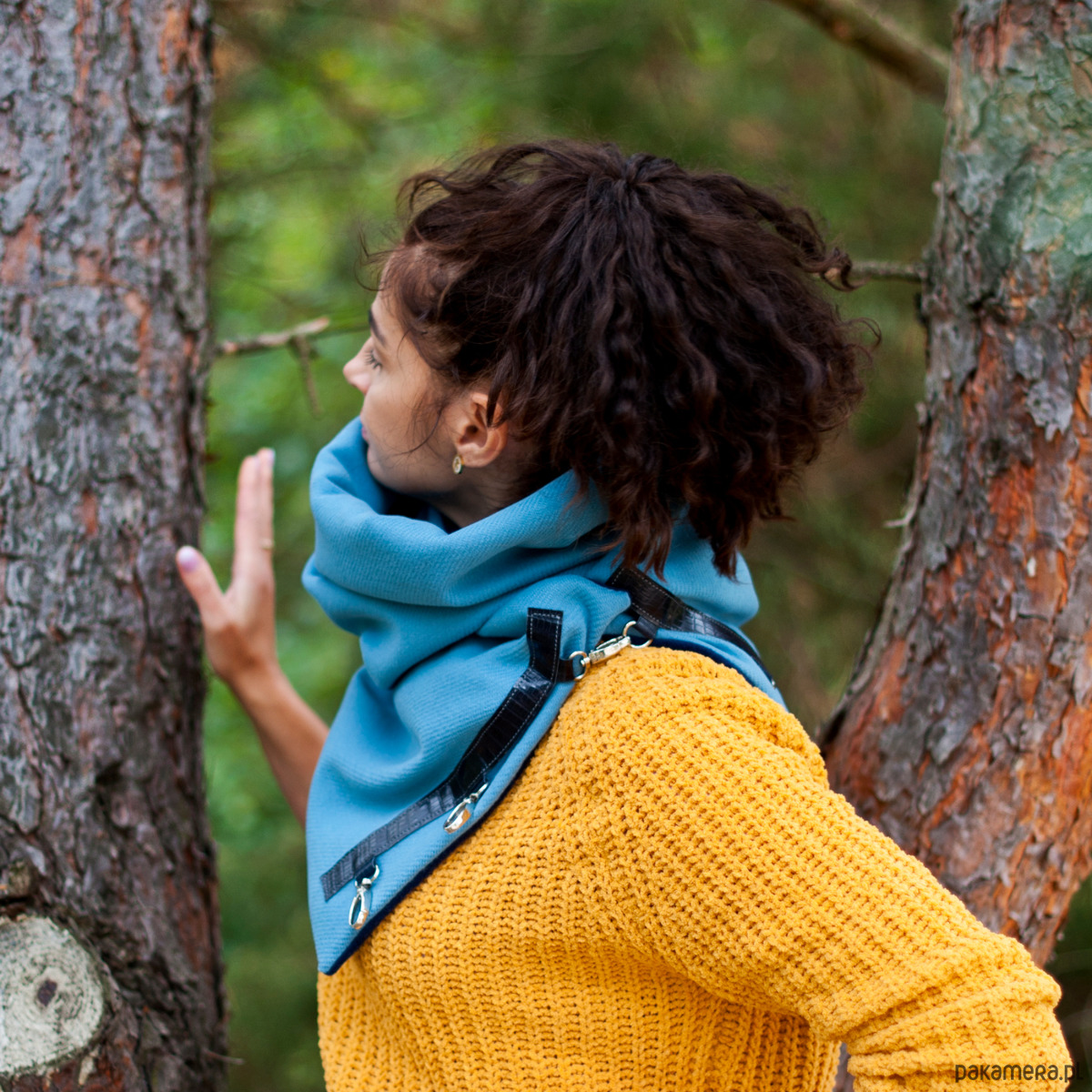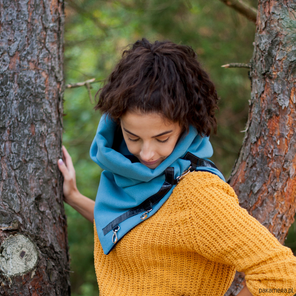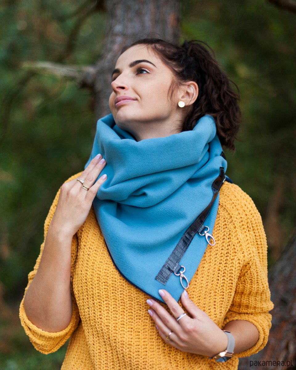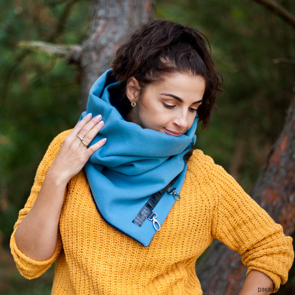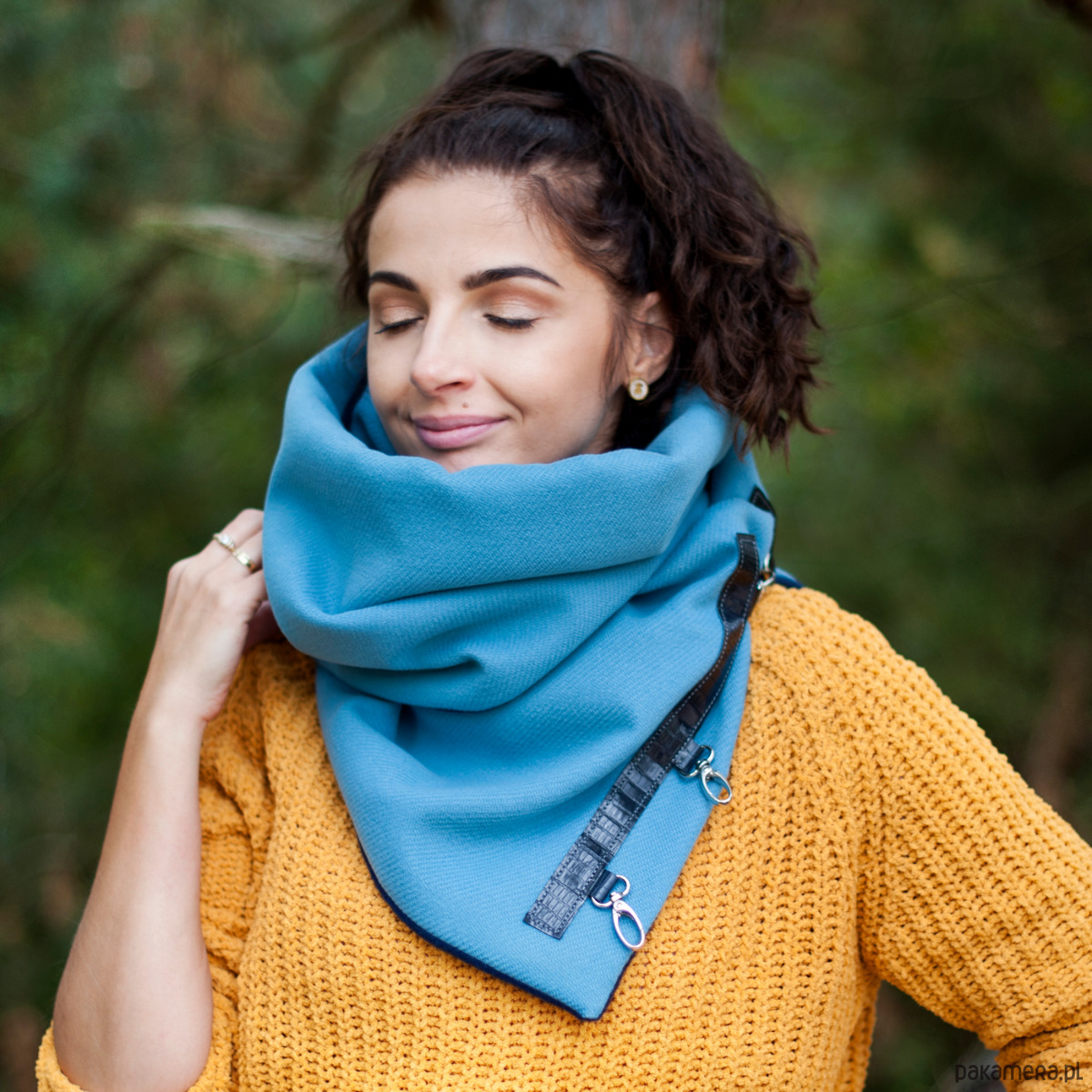 Bardzo starannie wykonany szal zapinany na 3 karabińczyki. Szal zostały wykonany z 2 warstw materiału - wierzchnia - miękka, ciepła wełna w błękitnym kolorze, spód z miłego w dotyku granatowego polaru. Szal zdobiony jest naturalną skórą w kolorze granatowym, tłoczonej we wzór krokodyla oraz metalowymi zapięciami.