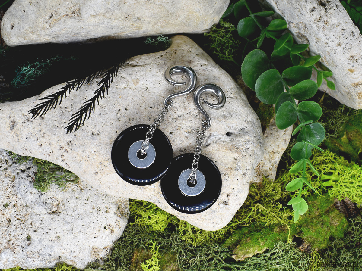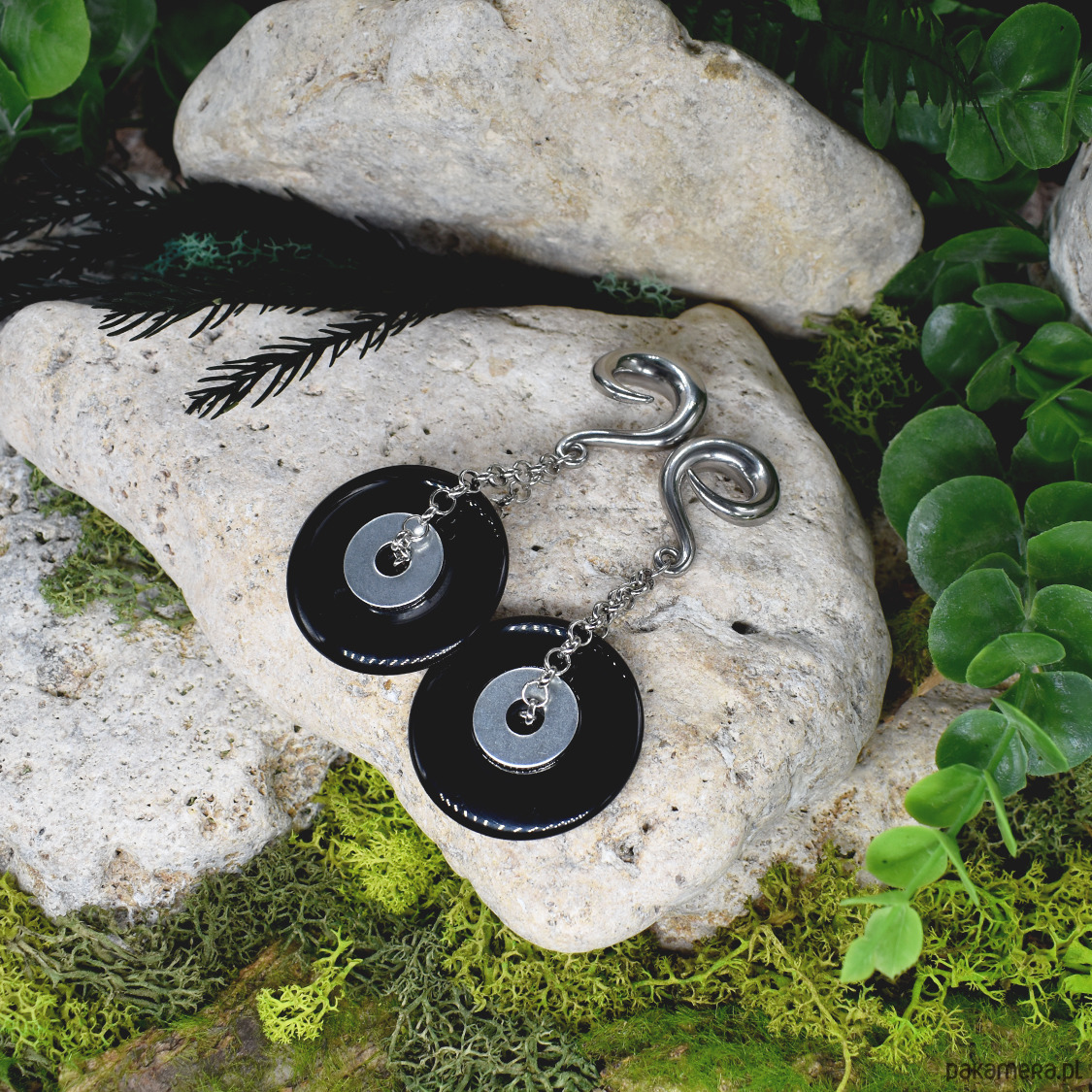 Ręcznie wykonane ciężarki do uszu z czarnym agatem w formie donutów. Kamienie zawieszone na łańcuszku rolo 4mm i haczyku ze stali chirurgicznej. Ciężarki są bezpieczną alternatywą dla taperów przy rozciąganiu uszu.