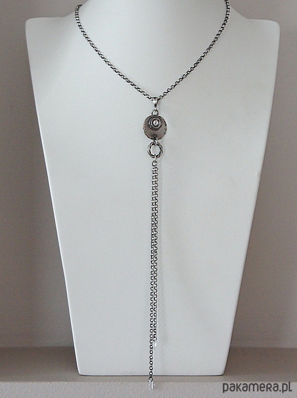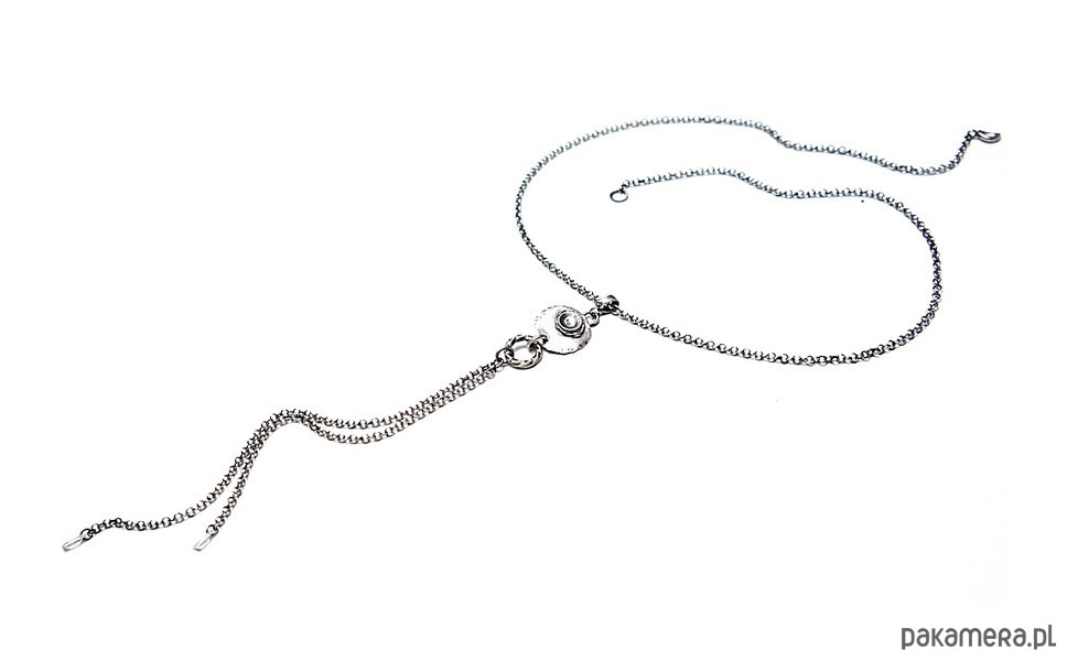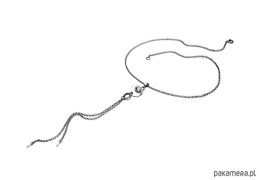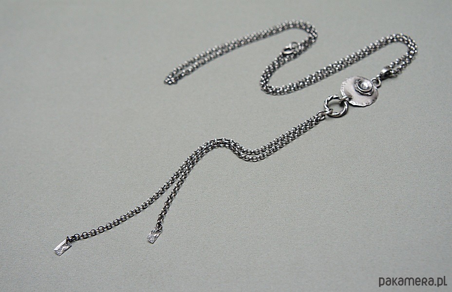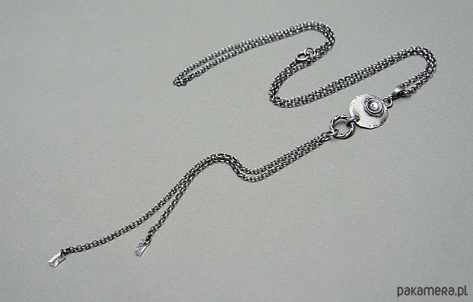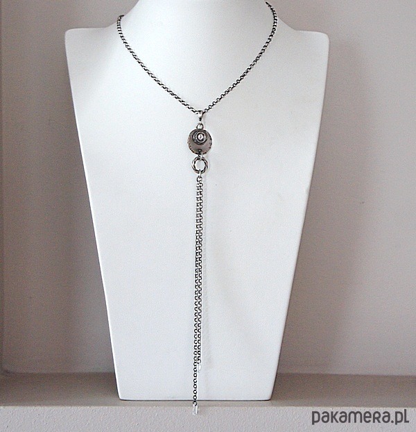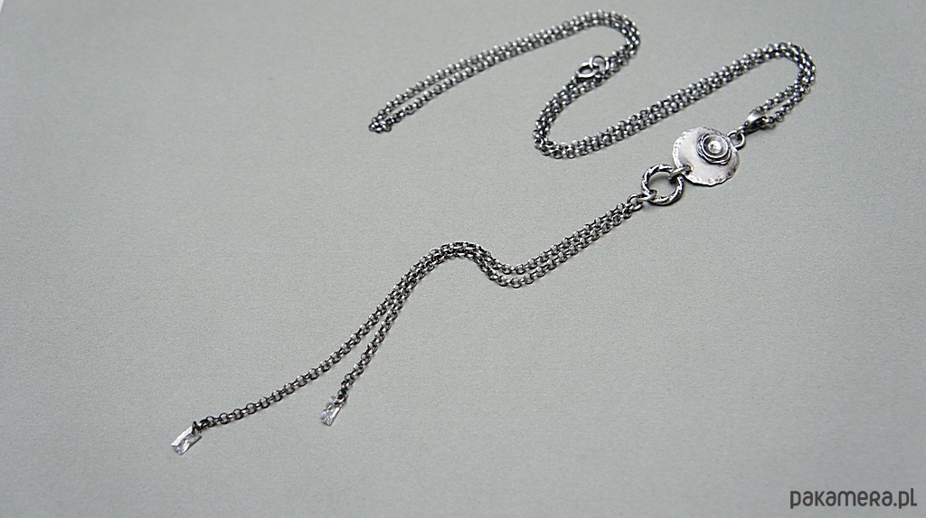 Naszyjnik wykonany ze srebra [pr. 925] w połączeniu z kryształkiem Swarovski zatopionym w miseczceoraz cyrkoniami w kształcie bagietek. Srebro oksydowane i przetarte. Całkowita długość łańcuszka 44,5cm. Długość części wiszącej 17,5cm. Biżuteria ozdobnie zapakowana
