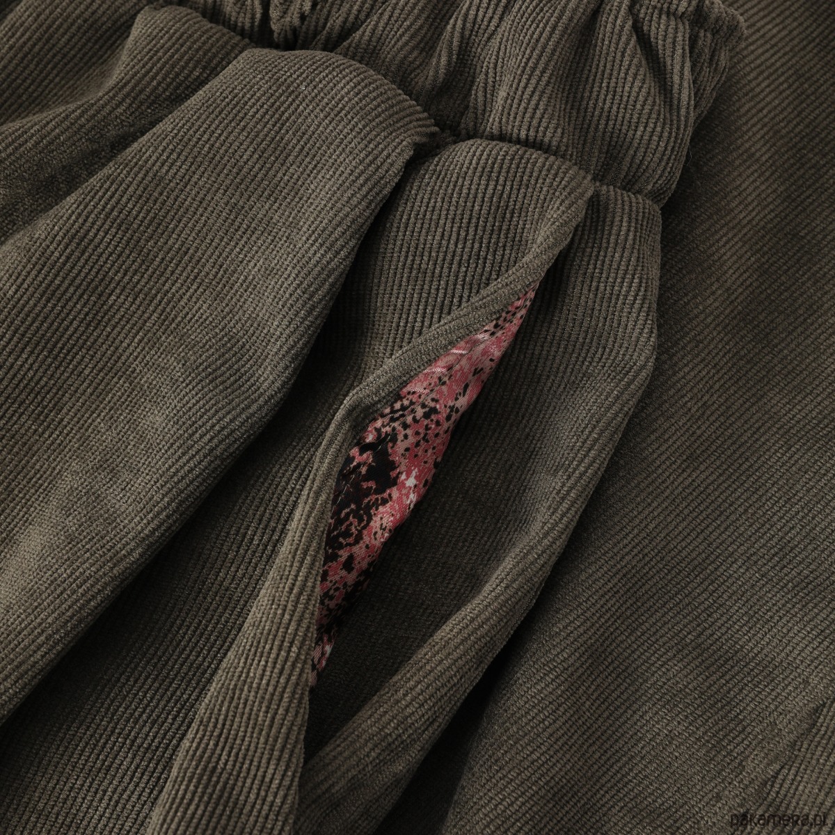 Przód spodni urozmaicają symetrycznie rozmieszczone szerokie zaszewki. Po bokach dwie spore i wygodne kieszenie z wzorzystą podszewką. Góra wykończona szerokim pasem z wszytą wewnątrz gumą.