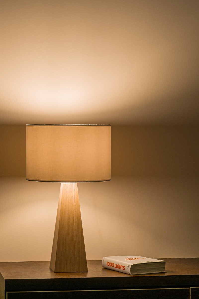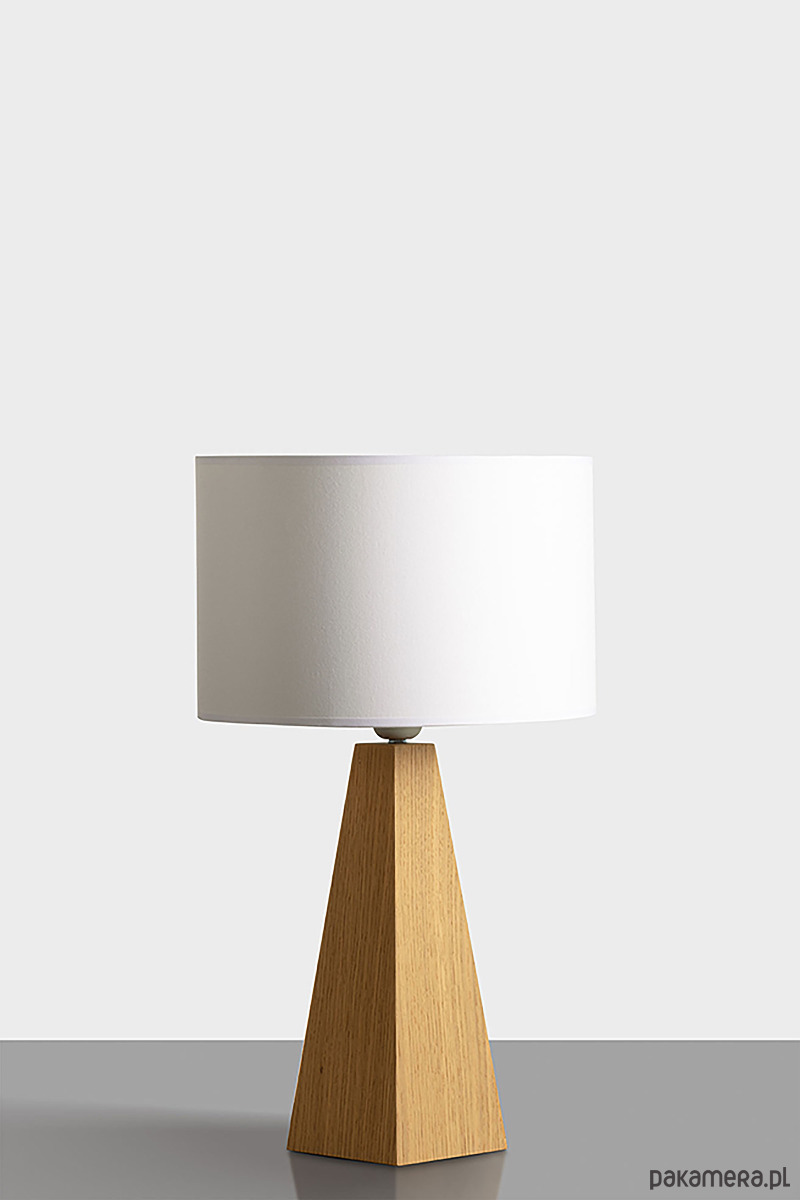 Lampa stołowa/nocna w kształcie graniastosłupa z okrągłym kloszem. Wykonana z płyty drewnopochodnej, wykończona okleiną drewnianą. Prosta i lekka - pasująca do niemal każdego wnętrza. Lampa tworzy niesamowicie przytulną atmosferę.
