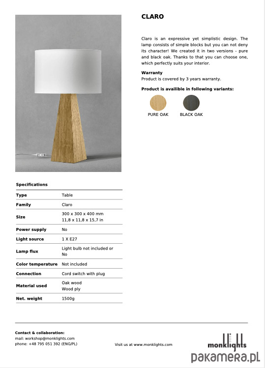 Claro to wyrazisty, ale wciąż prosty design. Lampa składa się z prostych elementów, jednak nie można odmówić jej charakteru! Claro posiada dwie wersje wykończenia - Naturalny Dąb oraz Czarny Dąb. Dzięki temu możesz wybrać opcję, która idealnie pasuje do Twojego wnętrza.