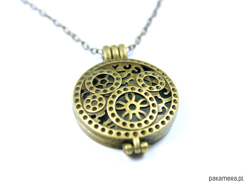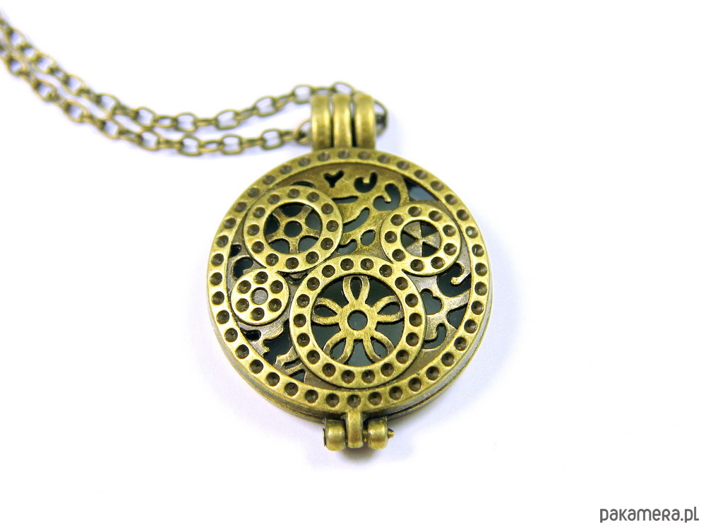 Uroczy wisiorek - puzderko z brązu. Ciekawe zdobienie a dodatkowo środek wypełniony masą fluorescencyjną przez co cudnie iluminuje wieczorem delikatną poświatą :-) Magicznie to wygląda i z pewnością zaskoczy otoczenie.