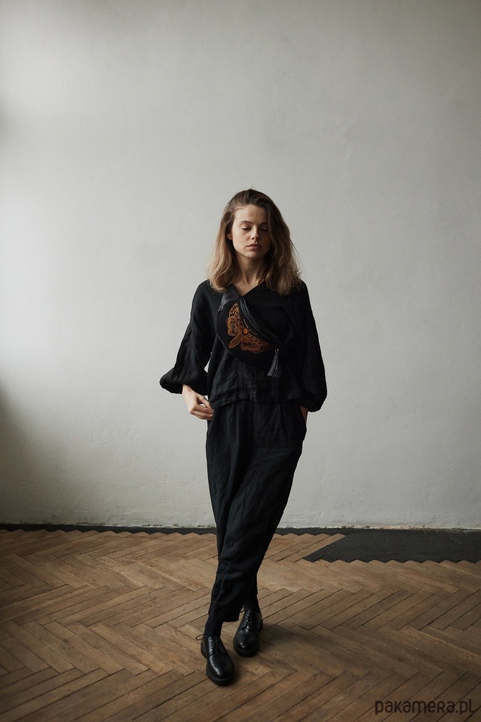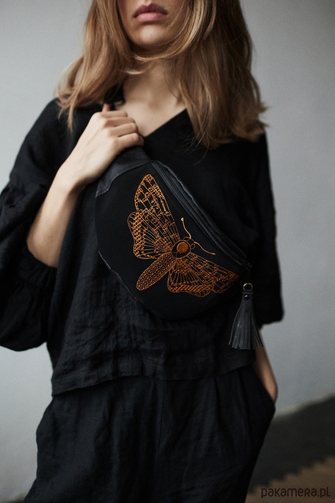 Tajemnicza i uwodzicielska ćma! Urzekający haft wykonany jest na czarnym, matowym froncie z eko-nubuku - idealne tło, które podkreśla nici w kolorze miedzianym.