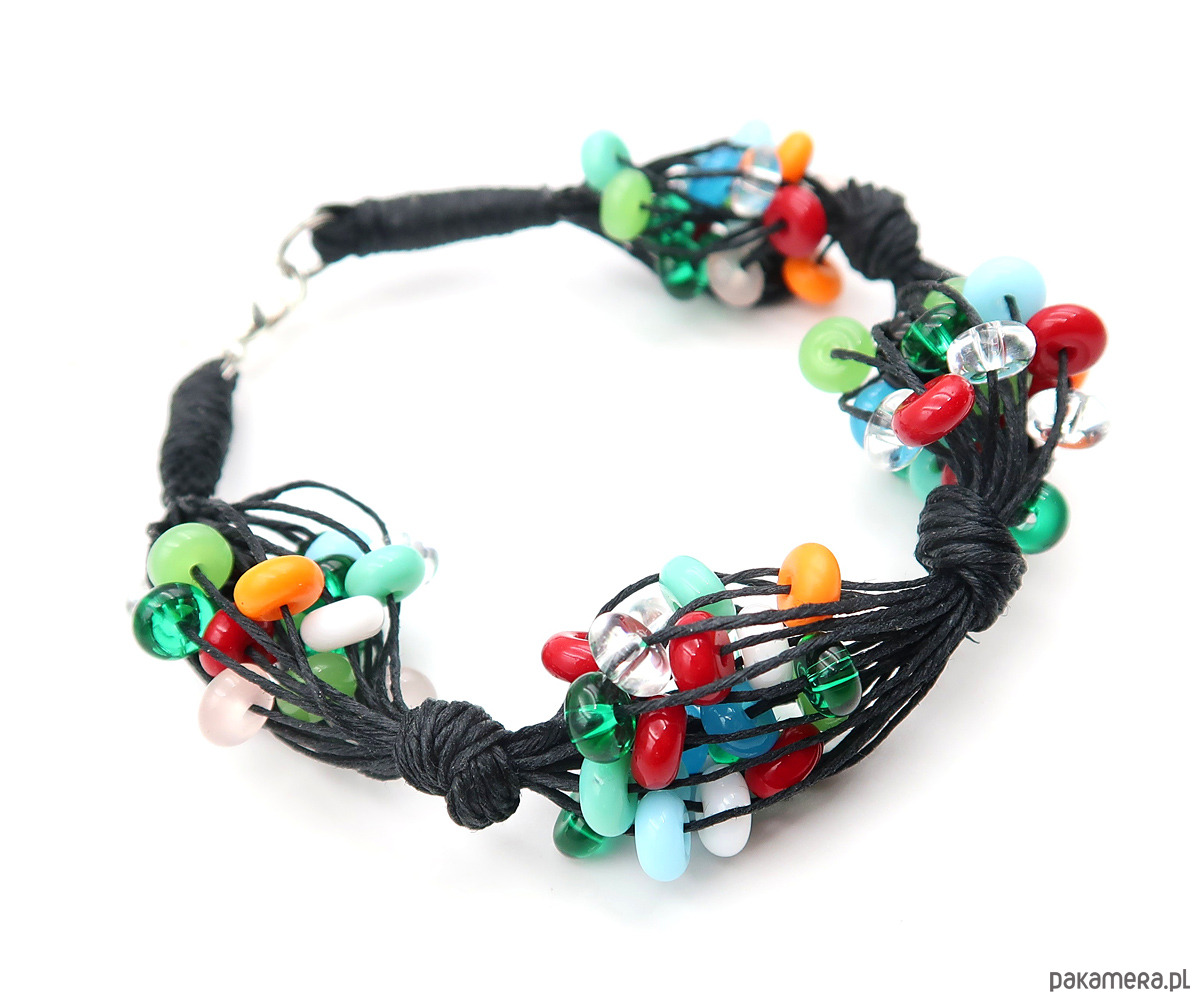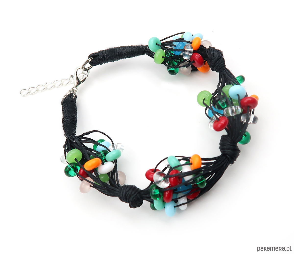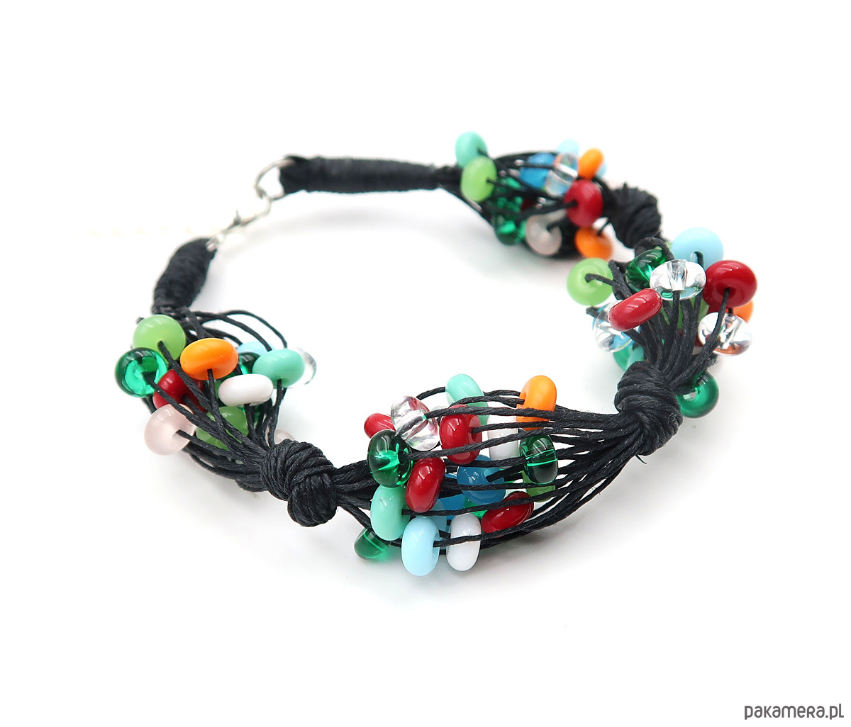 Elegancka bransoleta utrzymana w tonacji głębokiej czerni, przełamanej wielobarwnymi szklanymi koralikami, wykonana na bazie polskiej przędzy lnianej. W splocie wykorzystano piękne szklane korale czeskiej firmy Jablonex, które nadają całości wyrazistego i artystycznego charakteru.