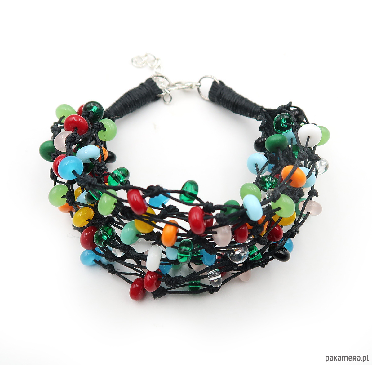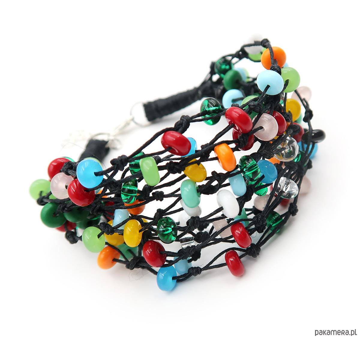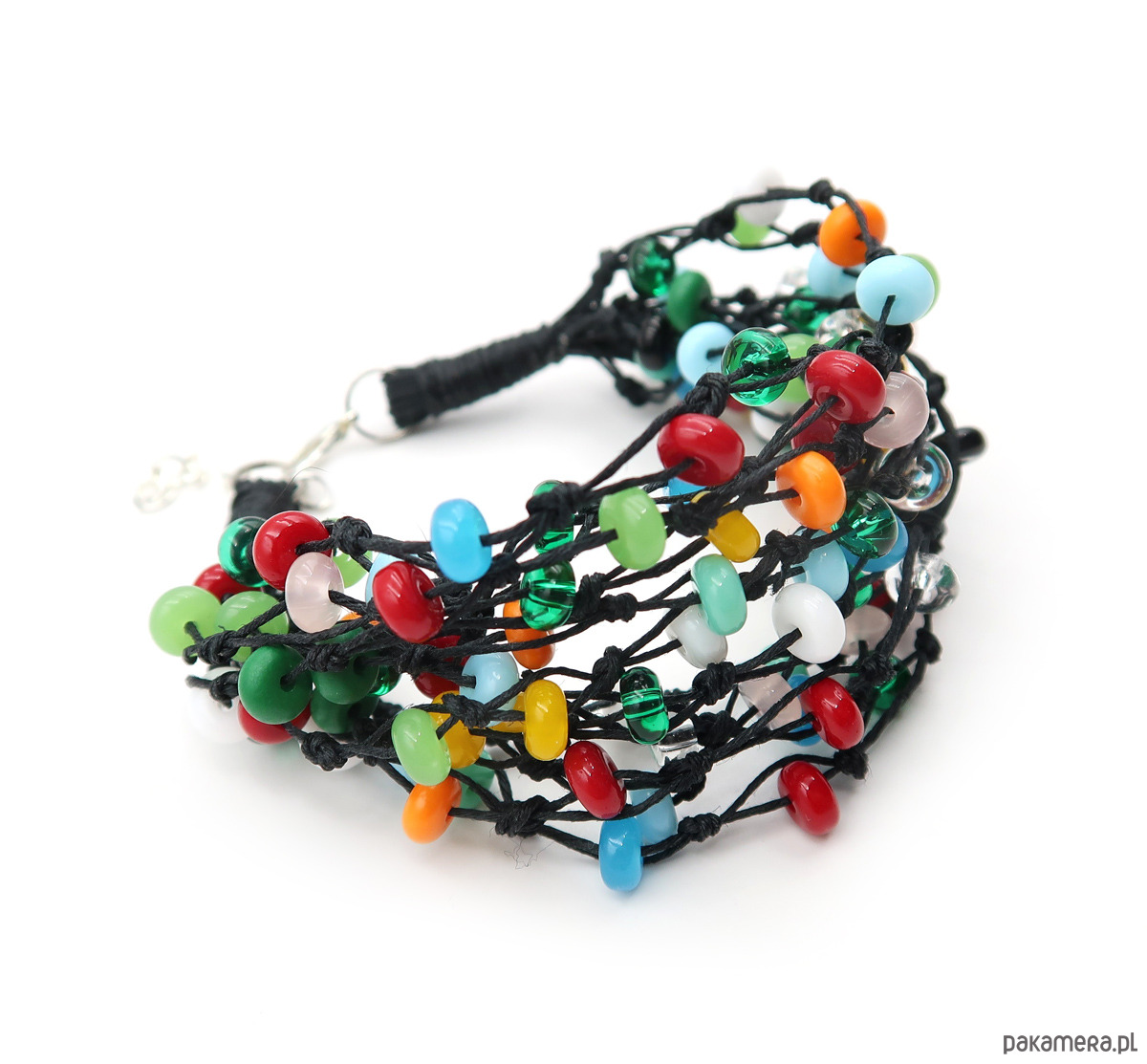 Elegancka bransoleta utrzymana w tonacji głębokiej czerni, przełamanej wielobarwnymi szklanymi koralikami, wykonana na bazie polskiej przędzy lnianej. W splocie wykorzystano piękne szklane korale czeskiej firmy Jablonex, które nadają całości wyrazistego i artystycznego charakteru.