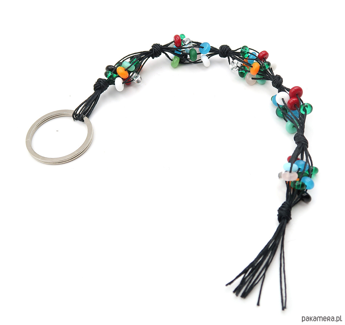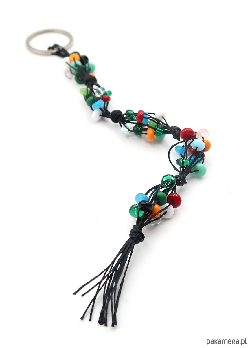 Elegancki brelok wykonany na bazie polskiej przędzy lnianej, w tonacji głębokiej czerni z wplecionymi szklanymi koralami czeskiej firmy Jablonex.